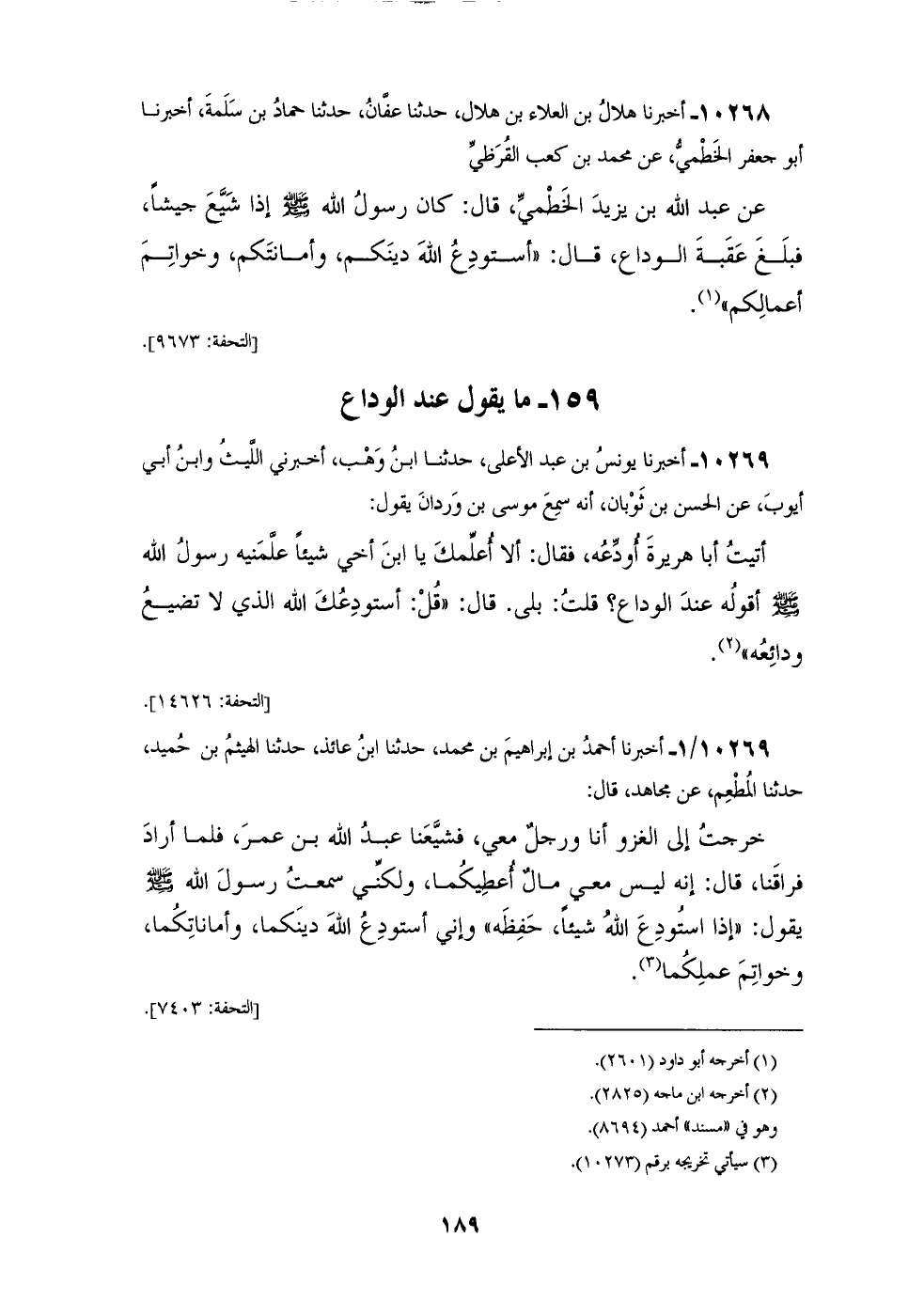 10269 - أَخْبَرَنَا يُونُسُ بْنُ عَبْدِ الْأَعْلَى، حَدَّثَنَا ابْنُ وَهْبٍ، أَخْبَرَنِي اللَّيْثُ، وَابْنُ أَبِي أَيُّوبَ، عَنِ الْحَسَنِ بْنِ ثَوْبَانَ، أَنَّهُ سَمِعَ مُوسَى بْنَ وَرْدَانَ، يَقُولُ: أَتَيْتُ أَبَا هُرَيْرَةَ أُوَدِّعُهُ فَقَالَ: أَلَا أُعَلِّمُكَ يَا ابْنَ أَخِي شَيْئًا عَلَّمَنِيهِ رَسُولُ اللهِ صَلَّى اللهُ عَلَيْهِ وَسَلَّمَ، أَقَوْلُهُ عِنْدَ الْوَدَاعِ؟ قُلْتُ: بَلَى، قَالَ: قُلْ: «§أَسْتَوْدِعُكَ اللهَ الَّذِي لَا تَضِيعُ وَدَائِعُهُ»