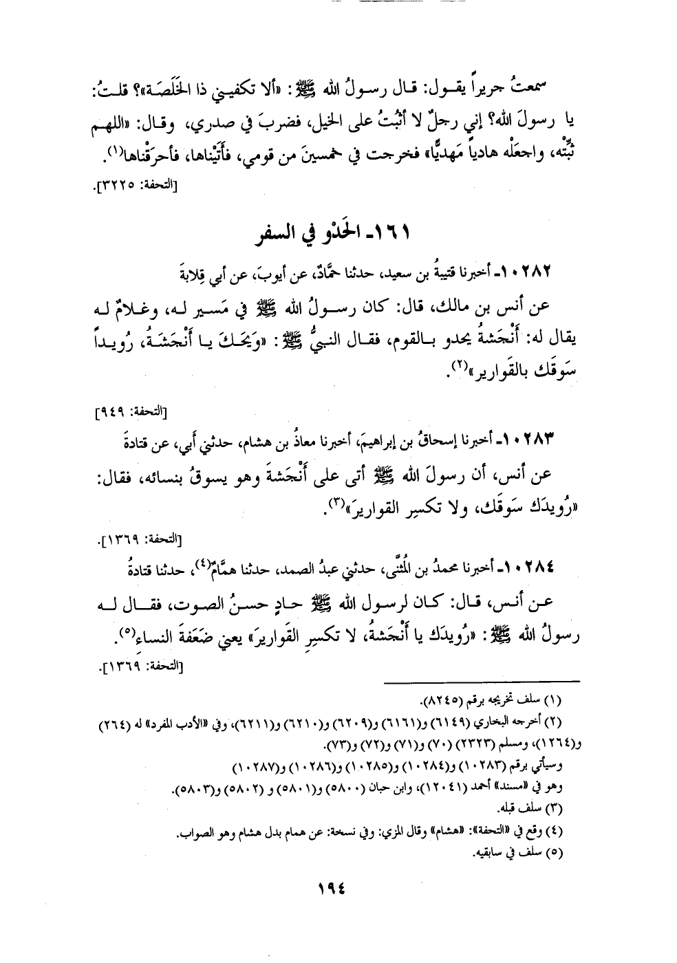 10282 - أَخْبَرَنَا قُتَيْبَةُ بْنُ سَعِيدٍ، حَدَّثَنَا حَمَّادٌ، عَنْ أَيُّوبَ، عَنْ أَبِي قِلَابَةَ، عَنْ أَنَسِ بْنِ مَالِكٍ، قَالَ: كَانَ رَسُولُ اللهِ صَلَّى اللهُ عَلَيْهِ وَسَلَّمَ فِي مَسِيرٍ لَهُ، وَغُلَامٌ لَهُ يُقَالُ لَهُ أَنْجَشَةُ يَحْدُو بِالْقَوْمِ، فَقَالَ النَّبِيُّ صَلَّى اللهُ عَلَيْهِ وَسَلَّمَ: «§وَيْحَكَ يَا أَنْجَشَةُ، رُوَيْدًا سَوْقَكَ بِالْقَوَارِيرِ»