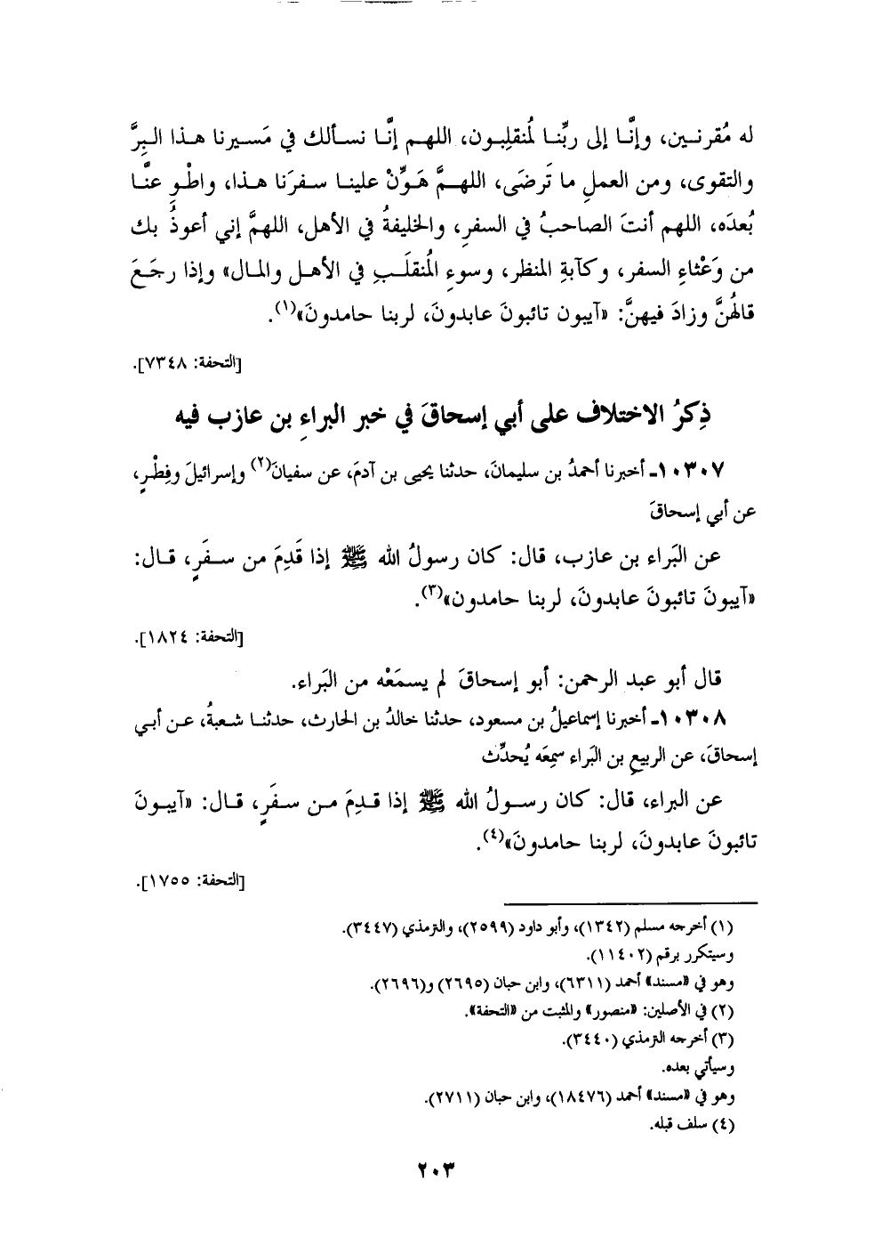 10307 - أَخْبَرَنَا أَحْمَدُ بْنُ سُلَيْمَانَ، حَدَّثَنَا يَحْيَى بْنُ آدَمَ، عَنْ سُفْيَانَ، وَإِسْرَائِيلَ، وَفِطْرٍ، عَنْ أَبِي إِسْحَاقَ، عَنِ الْبَرَاءِ بْنِ عَازِبٍ، قَالَ: كَانَ رَسُولُ اللهِ صَلَّى اللهُ عَلَيْهِ وَسَلَّمَ إِذَا قَدِمَ مِنْ سَفَرٍ قَالَ: «§آيِبُونَ، تَائِبُونَ، عَابِدُونَ، لِرَبِّنَا حَامِدُونَ» قَالَ أَبُو عَبْدِ الرَّحْمَنِ: أَبُو إِسْحَاقَ لَمْ يَسْمَعْهُ مِنَ الْبَرَاءِ