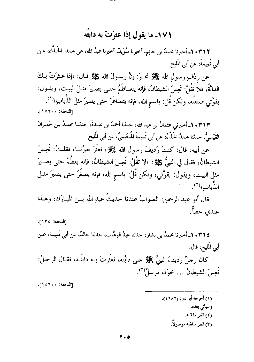 10312 - أَخْبَرَنَا مُحَمَّدُ بْنُ حَاتِمٍ، أَخْبَرَنَا سُوَيْدٌ، أَخْبَرَنَا عَبْدُ اللهِ، عَنْ خَالِدٍ الْحَذَّاءِ، عَنْ أَبِي تَمِيمَةَ، عَنْ أَبِي الْمَلِيحِ، عَنْ رِدْفِ، رَسُولِ اللهِ صَلَّى اللهُ عَلَيْهِ وَسَلَّمَ نَحْوَ إِنَّ رَسُولَ اللهِ صَلَّى اللهُ عَلَيْهِ وَسَلَّمَ قَالَ: " إِذَا §عَثَرَتْ بِكَ الدَّابَّةُ فَلَا تَقُلْ: تَعِسَ الشَّيْطَانُ، فَإِنَّهُ يَتَعَاظَمُ حَتَّى يَصِيرَ مِثْلَ الْبَيْتِ، وَيَقُولُ: بِقُوَّتِي صَنَعَتُهُ، وَلَكِنْ قُلْ: بِاسْمِ اللهِ، فَإِنَّهُ يَتَصَاغَرُ حَتَّى يَصِيرَ مِثْلَ الذُّبَابِ "
