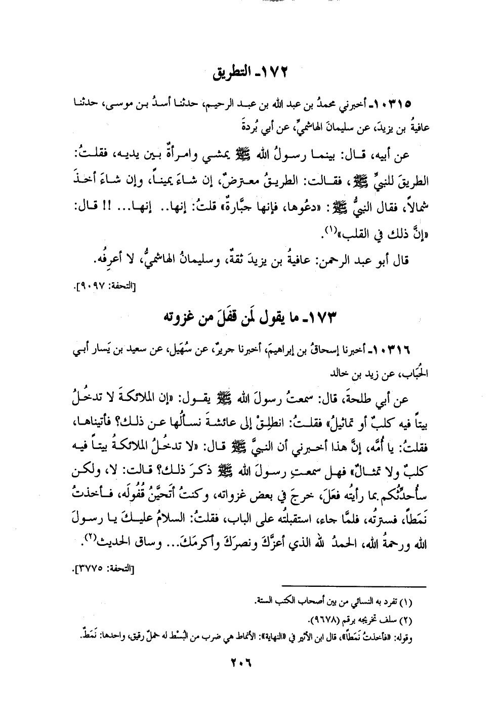10316 - أَخْبَرَنَا إِسْحَاقُ بْنُ إِبْرَاهِيمَ، أَخْبَرَنَا جَرِيرٌ، عَنْ سُهَيْلٍ، عَنْ سَعِيدِ بْنِ يَسَارٍ أَبِي الْحُبَابِ، عَنْ زَيْدِ بْنِ خَالِدٍ، عَنْ أَبِي طَلْحَةَ، قَالَ: سَمِعْتُ رَسُولَ اللهِ صَلَّى اللهُ عَلَيْهِ وَسَلَّمَ يَقُولُ: «إِنَّ §الْمَلَائِكَةَ لَا تَدْخُلُ بَيْتًا فِيهِ كَلْبٌ أَوْ تَمَاثِيلُ» فَقُلْتُ: انْطَلِقْ إِلَى عَائِشَةَ نَسْأَلُهَا عَنْ ذَلِكَ، فَأَتَيْنَاهَا فَقُلْتُ: يَا أُمَّهْ، إنَّ هَذَا أَخْبَرَنِي أَنَّ النَّبِيَّ صَلَّى اللهُ عَلَيْهِ وَسَلَّمَ قَالَ: «لَا تَدْخُلُ الْمَلَائِكَةَ بَيْتًا فِيهِ كَلْبٌ وَلَا تِمْثَالٌ» فَهَلْ سَمِعْتِ رَسُولَ اللهِ صَلَّى اللهُ عَلَيْهِ وَسَلَّمَ ذَكَرَ ذَلِكَ؟ قَالَتْ: لَا، وَلَكِنْ سَأُحَدِّثُكُمْ بِمَا رَأَيْتُهُ فَعَلَ، خَرَجَ فِي بَعْضِ غَزَوَاتِهِ، وَكُنْتُ أَتَحَيَّنُ قُفُولَهُ، فَأَخَذْتُ نَمَطًا فَسَتَرْتُهُ، فَلَمَّا جَاءَ اسْتَقْبَلْتُهُ عَلَى الْبَابِ فَقُلْتُ: السَّلَامُ عَلَيْكَ يَا رَسُولَ اللهِ وَرَحْمَةُ اللهِ، الْحَمْدُ لِلَّهِ الَّذِي أَعَزَّكَ وَنَصَرَكَ وَأَكْرَمَكَ. وَسَاقَ الْحَدِيثَ