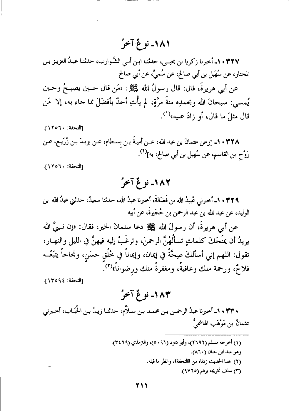 10327 - أَخْبَرَنَا زَكَرِيَّا بْنُ يَحْيَى، حَدَّثَنَا ابْنُ أَبِي الشَّوَارِبِ، حَدَّثَنَا عَبْدُ الْعَزِيزِ بْنُ الْمُخْتَارِ، عَنْ سُهَيْلِ بْنِ أَبِي صَالِحٍ، عَنْ سُمَيٍّ، عَنْ أَبِي صَالِحٍ، عَنْ أَبِي هُرَيْرَةَ، قَالَ: قَالَ رَسُولُ اللهِ صَلَّى اللهُ عَلَيْهِ وَسَلَّمَ: " §مَنْ قَالَ حِينَ يُصْبِحُ وَحِينَ يُمْسِي: سُبْحَانَ اللهِ وَبِحَمْدِهِ مِائَةَ مَرَّةٍ، لَمْ يَأْتِ أَحَدٌ بِأَفْضَلَ مِمَّا جَاءَ بِهِ إِلَّا مَنْ قَالَ مِثْلَ مَا قَالَ أَوْ زَادَ عَلَيْهِ "