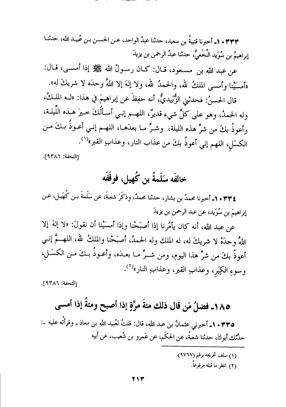 10333 - أَخْبَرَنَا قُتَيْبَةُ بْنُ سَعِيدٍ، حَدَّثَنَا عَبْدُ الْوَاحِدِ، عَنِ الْحَسَنِ بْنِ عُبَيْدِ اللهِ، حَدَّثَنَا إِبْرَاهِيمُ بْنُ سُوَيْدٍ النَّخَعِيُّ، حَدَّثَنَا عَبْدُ الرَّحْمَنِ بْنُ يَزِيدَ، عَنْ عَبْدِ اللهِ بْنِ مَسْعُودٍ، قَالَ: كَانَ رَسُولُ اللهِ صَلَّى اللهُ عَلَيْهِ وَسَلَّمَ إِذَا أَمْسَى قَالَ: «§أَمْسَيْنَا وَأَمْسَى الْمُلْكُ لِلَّهِ، وَالْحَمْدُ لِلَّهِ، وَلَا إِلَهَ إِلَّا اللهُ، وَحْدَهُ لَا شَرِيكَ لَهُ» قَالَ الْحَسَنُ: فَحَدَّثَنِي الزُّبَيْدِيُّ، أَنَّهُ حَفِظَ عَنْ إِبْرَاهِيمَ فِي هَذَا «لَهُ الْمُلْكُ، وَلَهُ الْحَمْدُ، وَهُوَ عَلَى كُلِّ شَيْءٍ قَدِيرٌ، اللهُمَّ إِنِّي أَسْأَلُكَ خَيْرَ هَذِهِ اللَّيْلَةِ، وَأَعُوذُ بِكَ مِنْ شَرِّ هَذِهِ اللَّيْلَةِ، وَشَرِّ مَا بَعْدَهَا، اللهُمَّ إِنِّي أَعُوذُ بِكَ مِنَ الْكَسَلِ، اللهُمَّ إِنِّي أَعُوذُ بِكَ مِنْ عَذَابِ النَّارِ وَعَذَابِ الْقَبْرِ» خَالَفَهُ سَلَمَةُ بْنُ كُهَيْلٍ فَوَقَفَهُ