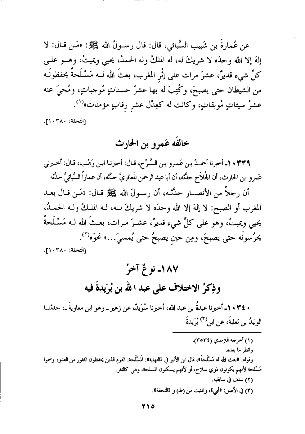 10338 - أَخْبَرَنَا قُتَيْبَةُ بْنُ سَعِيدٍ، حَدَّثَنَا اللَّيْثُ، عَنِ الْجَلَّاحِ أَبِي كَثِيرٍ، عَنْ أَبِي عَبْدِ الرَّحْمَنِ الْحُبُلِيِّ، عَنْ عُمَارَةَ بْنِ شَبِيبٍ السَّبَائِيِّ، قَالَ: قَالَ رَسُولُ اللهِ صَلَّى اللهُ عَلَيْهِ وَسَلَّمَ: " §مَنْ قَالَ: لَا إِلَهَ إِلَّا اللهُ، وَحْدَهُ لَا شَرِيكَ لَهُ، لَهُ الْمُلْكُ وَلَهُ الْحَمْدُ، يُحْيِي وَيُمِيتُ، وَهُوَ عَلَى كُلِّ شَيْءٍ قَدِيرٌ، عَشْرَ مَرَّاتٍ عَلَى إِثْرِ الْمَغْرِبِ بَعَثَ اللهُ لَهُ مَسْلَحَةً يَحْفَظُونَهُ مِنَ الشَّيْطَانِ حَتَّى يُصْبِحَ، وَكُتِبَ لَهُ بِهَا عَشْرَ حَسَنَاتٍ مُوجِبَاتٍ، وَمُحِيَ عَنْهُ عَشْرُ سَيِّئَاتٍ مُوبِقَاتٍ، وَكَانَتْ لَهُ كَعَدْلِ عَشْرِ رِقَابٍ مُؤْمِنَاتٍ " خَالَفَهُ عَمْرُو بْنُ الْحَارِثِ،