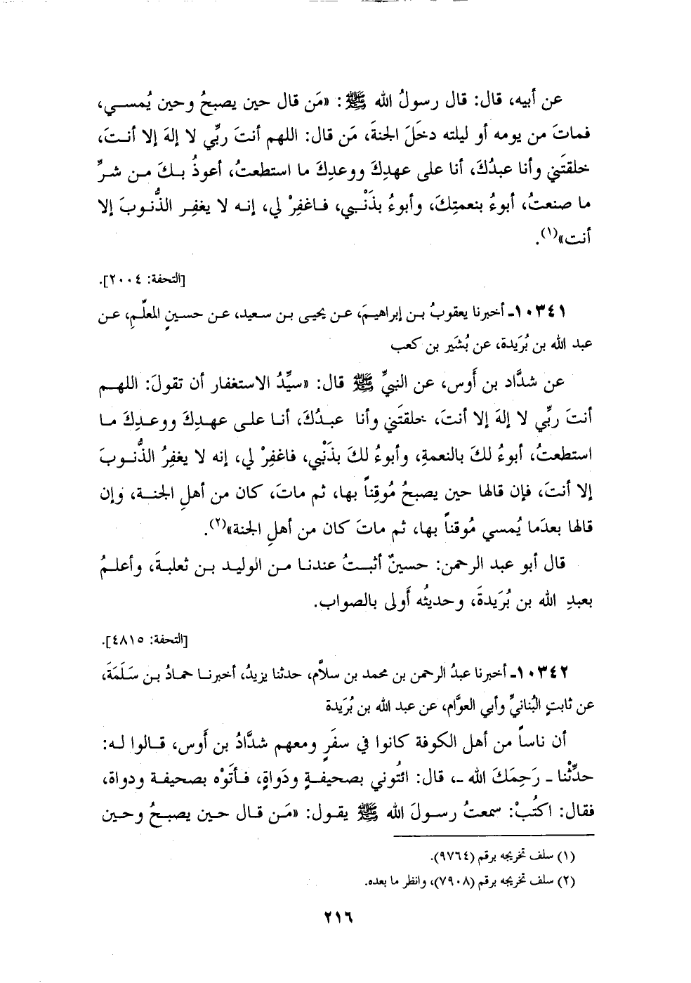10340 - أَخْبَرَنَا عَبْدَةُ بْنُ عَبْدِ اللهِ، أَخْبَرَنَا سُوَيْدٌ، عَنْ زُهَيْرٍ وَهُوَ ابْنُ مُعَاوِيَةَ، حَدَّثَنَا الْوَلِيدُ بْنُ ثَعْلَبَةَ، عَنِ ابْنِ بُرَيْدَةَ، عَنْ أَبِيهِ، قَالَ: قَالَ رَسُولُ اللهِ صَلَّى اللهُ عَلَيْهِ وَسَلَّمَ: " §مَنْ قَالَ حِينَ يُصْبِحُ وَحِينَ يُمْسِي، فَمَاتَ مِنْ يَوْمِهِ أَوْ لَيْلَتِهِ دَخَلَ الْجَنَّةَ، مَنْ قَالَ: اللهُمَّ أَنْتَ رَبِّي، لَا إِلَهَ إِلَّا أَنْتَ، خَلَقْتَنِي وَأَنَا عَبْدُكَ، أَنَا عَلَى عَهْدِكَ وَوَعْدِكَ مَا اسْتَطَعْتُ، أَعُوذُ بِكَ مِنْ شَرِّ مَا صَنَعْتُ، أَبُوءُ بِنِعْمَتِكَ، وَأَبُوءُ بِذَنْبِي، فَاغْفِرْ لِي إِنَّهُ لَا يَغْفِرُ الذُّنُوبَ إِلَّا أَنْتَ "
