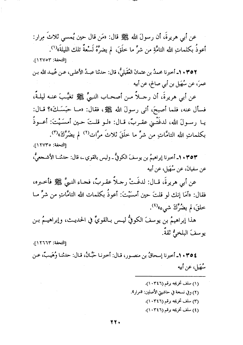 10353 - أَخْبَرَنَا إِبْرَاهِيمُ بْنُ يُوسُفَ الْكُوفِيُّ، - وَلَيْسَ بِالْقَوِيِّ - قَالَ: حَدَّثَنَا الْأَشْجَعِيُّ، عَنْ سُفْيَانَ، عَنْ سُهَيْلٍ، عَنْ أَبِيهِ، عَنْ أَبِي هُرَيْرَةَ قَالَ: لَدَغَتْ رَجُلًا عَقْرَبٌ، فَجَاءَ النَّبِيَّ صَلَّى اللهُ عَلَيْهِ وَسَلَّمَ فَأَخْبَرَهُ فَقَالَ: " §أَمَا إِنَّكَ لَوْ قُلْتَ حِينَ أَمْسَيْتَ: أَعُوذُ بِكَلِمَاتِ اللهِ التَّامَّاتِ مِنْ شَرِّ مَا خَلَقَ لَمْ يَضُرَّكَ شَيْءٌ " هَذَا إِبْرَاهِيمُ بْنُ يُوسُفَ الْكُوفِيُّ لَيْسَ بِالْقَوِيِّ فِي الْحَدِيثِ، وَإِبْرَاهِيمُ بْنُ يُوسُفَ الْبَلْخِيُّ ثِقَةٌ