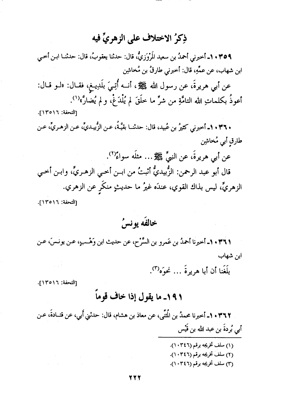 10360 - أَخْبَرَنِي كَثِيرُ بْنُ عُبَيْدٍ، قَالَ: حَدَّثَنَا بَقِيَّةُ، عَنِ الزُّبَيْدِيِّ، عَنِ الزُّهْرِيِّ، عَنْ طَارِقٍ أَبِي مَخَاشِنٍ، عَنْ أَبِي هُرَيْرَةَ عَنِ النَّبِيِّ صَلَّى اللهُ عَلَيْهِ وَسَلَّمَ، مِثْلَهُ سَوَاءٌ، قَالَ أَبُو عَبْدِ الرَّحْمَنِ الزُّبَيْدِيُّ أَثْبَتُ مِنَ ابْنِ أَخِي الزُّهْرِيِّ، وَابْنُ أَخِي الزُّهْرِيِّ لَيْسَ بِذَاكَ الْقَوِيِّ، عِنْدَهُ غَيْرُ مَا حَدِيثٍ مُنْكَرٍ عَنِ الزُّهْرِيِّ، خَالَفَهُ يُونُسُ،