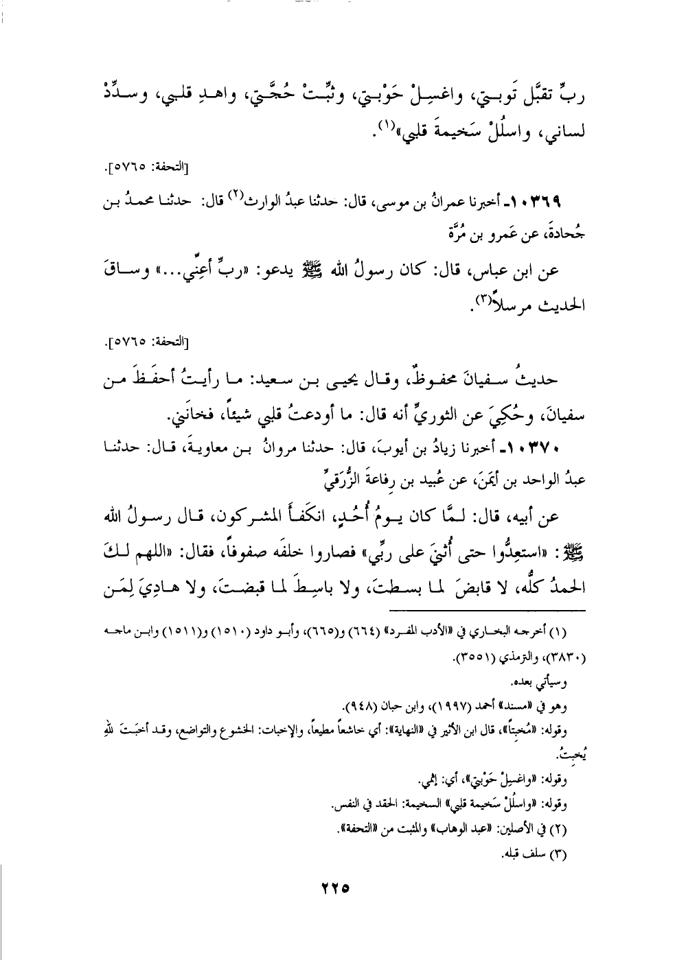 10370 - أَخْبَرَنَا زِيَادُ بْنُ أَيُّوبَ، قَالَ: حَدَّثَنَا مَرْوَانُ بْنُ مُعَاوِيَةَ، قَالَ: حَدَّثَنَا عَبْدُ الْوَاحِدِ بْنُ أَيْمَنَ، عَنْ عُبَيْدِ بْنِ رِفَاعَةَ الزُّرَقِيِّ، عَنْ أَبِيهِ، قَالَ: لَمَّا كَانَ يَوْمُ أُحُدٍ انْكَفَأَ الْمُشْرِكُونَ، قَالَ رَسُولُ اللهِ صَلَّى اللهُ عَلَيْهِ وَسَلَّمَ: «اسْتَعِدُّوا حَتَّى أُثْنِيَ عَلَى رَبِّي» فَصَارُوا خَلْفَهُ صُفُوفًا، فَقَالَ: «§اللهُمَّ لَكَ الْحَمْدُ كُلُّهُ، لَا قَابِضَ لِمَا بَسَطْتَ، وَلَا بَاسِطَ لِمَا قَبَضْتَ، وَلَا هَادِيَ لِمَنْ أَضْلَلْتَ، وَلَا مُضِلَّ لِمَنْ هَدَيْتَ، وَلَا مُعْطِيَ لِمَا مَنَعْتَ، وَلَا مَانِعَ لِمَا أَعْطَيْتَ، وَلَا مُقَرِّبَ لِمَا بَاعَدْتَ، وَلَا مُبَاعِدَ لِمَا قَرَّبْتَ، اللهُمَّ ابْسُطْ عَلَيْنَا مِنْ بَرَكَاتِكَ وَرَحْمَتِكَ وَفَضْلِكَ وَرِزْقِكَ، اللهُمَّ إِنِّي أَسْأَلُكَ النَّعِيمَ الْمُقِيمَ الَّذِي لَا يَحُولُ وَلَا يَزُولُ، اللهُمَّ إِنِّي أَسْأَلُكَ النَّعِيمَ يَوْمَ الْعَيْلَةِ، وَالْأَمْنَ يَوْمَ الْخَوْفِ، اللهُمَّ عَائِذٌ بِكَ مِنْ شَرِّ مَا أَعْطَيْتَنَا، وَشَرِّ مَا مَنَعْتَنَا، اللهُمَّ حَبِّبْ إِلَيْنَا الْإِيمَانَ، وَزَيِّنْهُ فِي قُلُوبِنَا، وَكَرِّهْ إِلَيْنَا الْكُفْرَ وَالْفُسُوقَ وَالْعِصْيَانَ، وَاجْعَلْنَا مِنَ الرَّاشِدِينَ، اللهُمَّ تَوَفَّنَا مُسْلِمِينَ، وَأَحْيِنَا مُسْلِمِينَ، وَأَلْحِقْنَا بِالصَّالِحِينَ، غَيْرَ خَزَايَا وَلَا مَفْتُونِينَ، اللهُمَّ قَاتِلِ الْكَفَرَةَ الَّذِينَ يُكِذِّبُونَ رُسُلَكَ، وَيَصُدُّونَ عَنْ سَبِيلِكَ، وَاجْعَلْ عَلَيْهِمْ رِجْزَكَ وَعَذَابَكَ، إِلَهَ الْحَقِّ آمِينَ» -[226]- خَالَفَهُ أَبُو نُعَيْمٍ فَأَرْسَلَ الْحَدِيثَ
