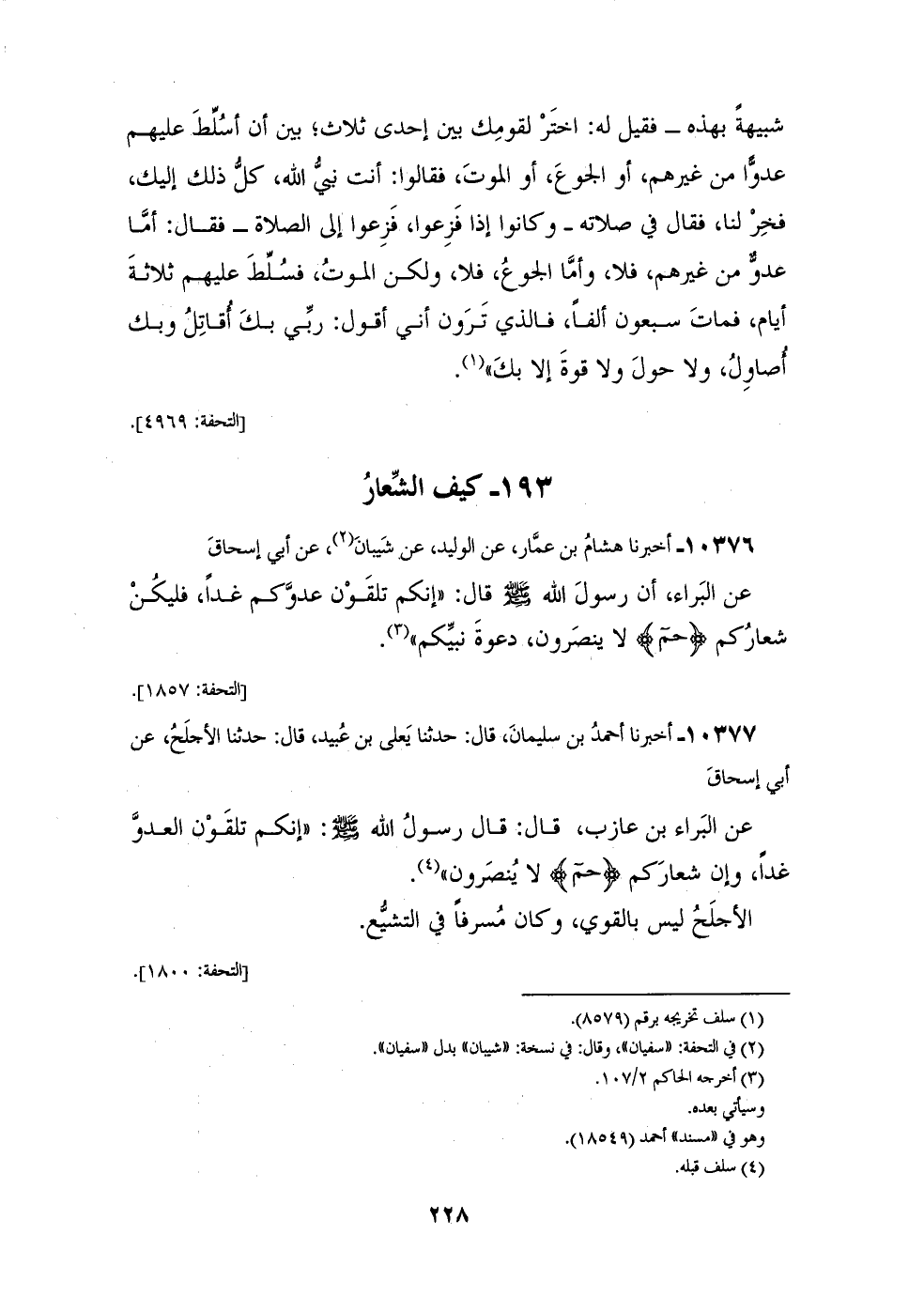 10377 - أَخْبَرَنَا أَحْمَدُ بْنُ سُلَيْمَانَ، قَالَ: حَدَّثَنَا يَعْلَى بْنُ عُبَيْدٍ، قَالَ: حَدَّثَنَا الْأَجْلَحُ، عَنْ أَبِي إِسْحَاقَ، عَنِ الْبَرَاءِ بْنِ عَازِبٍ، قَالَ: قَالَ رَسُولُ اللهِ صَلَّى اللهُ عَلَيْهِ وَسَلَّمَ: «§إِنَّكُمْ تَلْقَوْنَ الْعَدُوَّ غَدًا، وَإِنَّ شِعَارَكُمْ حم لَا يُنْصَرُونَ» الْأَجْلَحُ لَيْسَ بِالْقَوِيِّ وَكَانَ مُسْرِفًا فِي التَّشَيُّعِ -[229]-، خَالَفَهُمَا زُهَيْرٌ وَشَرِيكٌ فِي الْإِسْنَادِ وَاللَّفْظِ عَلَى اخْتِلَافِهِمَا فِيهِ