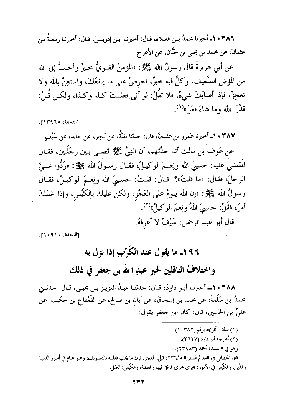 10386 - أَخْبَرَنَا مُحَمَّدُ بْنُ الْعَلَاءِ، قَالَ: أَخْبَرَنَا ابْنُ إِدْرِيسَ، قَالَ: أَخْبَرَنَا رَبِيعَةُ بْنُ عُثْمَانَ، عَنْ مُحَمَّدِ بْنِ يَحْيَى بْنِ حَبَّانَ، عَنِ الْأَعْرَجِ، عَنْ أَبِي هُرَيْرَةَ، قَالَ رَسُولُ اللهِ صَلَّى اللهُ عَلَيْهِ وَسَلَّمَ: " §الْمُؤْمِنُ الْقَوِيُّ خَيْرٌ وَأَحَبُّ إِلَى اللهِ مِنَ الْمُؤْمِنِ الضَّعِيفِ، وَكُلٌّ فِيهِ خَيْرٌ، احْرِصْ عَلَى مَا يَنْفَعُكَ، وَاسْتَعِنْ بِاللهِ وَلَا تَعْجَزْ، فَإِنْ أَصَابَكَ شَيْءٌ فَلَا تَقُلْ: لَوْ أَنِّي فَعَلْتُ كَذَا وَكَذَا، وَلَكِنْ قُلْ: قَدَّرَ اللهُ وَمَا شَاءَ فَعَلَ "