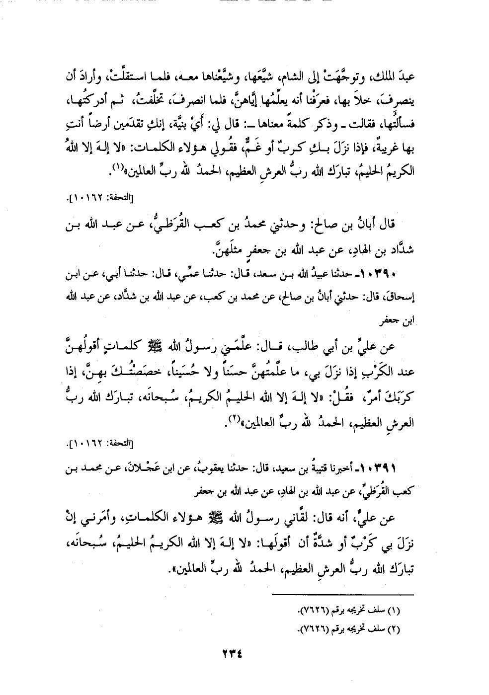 10391 - أَخْبَرَنَا قُتَيْبَةُ بْنُ سَعِيدٍ، قَالَ: حَدَّثَنَا يَعْقُوبُ، عَنِ ابْنِ عَجْلَانَ، عَنْ مُحَمَّدِ بْنِ كَعْبٍ الْقُرَظِيِّ، عَنْ عَبْدِ اللهِ بْنِ الْهَادِ، عَنْ عَبْدِ اللهِ بْنِ جَعْفَرٍ، عَنْ عَلِيٍّ، أَنَّهُ قَالَ: لَقَّانِي رَسُولُ اللهِ صَلَّى اللهُ عَلَيْهِ وَسَلَّمَ هَؤُلَاءِ الْكَلِمَاتِ، وَأَمَرَنِي إِنْ نَزَلَ بِي كَرْبٌ أَوْ شِدَّةٌ أَنْ أَقُولَهَا: «§لَا إِلَهَ إِلَّا اللهُ الْكَرِيمُ الْحَلِيمُ، سُبْحَانَهُ، تَبَارَكَ اللهُ رَبُّ الْعَرْشِ الْعَظِيمُ، الْحَمْدُ لِلَّهِ رَبُّ الْعَالَمِينَ» فَكَانَ عَبْدُ اللهِ بْنُ جَعْفَرٍ يُلَقِّنُهَا الْمَيِّتَ، وَيَنْفُثُ بِهَا عَلَى الْمَوْعُوكِ، وَيُعَلِّمُهَا الْمُغْتَرِبَةَ مِنْ بَنَاتِهِ