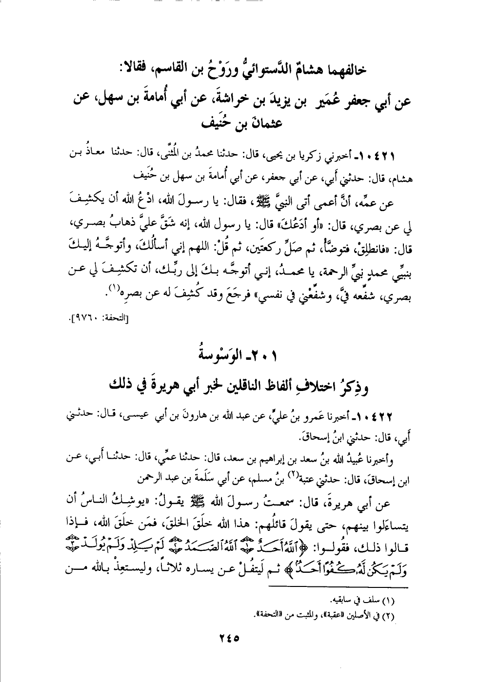 10421 - أَخْبَرَنِي زَكَرِيَّا بْنُ يَحْيَى، قَالَ: حَدَّثَنَا مُحَمَّدُ بْنُ الْمُثَنَّى، قَالَ: حَدَّثَنَا مُعَاذُ بْنُ هِشَامٍ، قَالَ: حَدَّثَنِي أَبِي، عَنْ أَبِي جَعْفَرٍ، عَنْ أَبِي أُمَامَةَ بْنِ سَهْلِ بْنِ حُنَيْفٍ، عَنْ عَمِّهِ: أَنَّ أَعْمَى، أَتَى النَّبِيَّ صَلَّى اللهُ عَلَيْهِ وَسَلَّمَ فَقَالَ: يَا رَسُولَ اللهِ، ادْعُ اللهَ أَنْ يَكْشِفَ لِي عَنْ بَصَرِي، قَالَ: «أَوْ أَدَعُكَ؟» قَالَ: يَا رَسُولَ اللهِ إِنَّهُ شَقَّ عَلَيَّ ذَهَابُ بَصَرِي، قَالَ: " §فَانْطَلِقْ فَتَوَضَّأْ، ثُمَّ صَلِّ رَكْعَتَيْنِ، ثُمَّ قُلِ: اللهُمَّ إِنِّي أَسْأَلُكَ وَأَتَوَجَّهُ إِلَيْكَ بِنَبِيِّي مُحَمَّدٍ نَبِيِّ الرَّحْمَةِ، يَا مُحَمَّدُ إِنِّي أَتَوَجَّهُ بِكَ إِلَى رَبِّكَ أَنْ تَكْشِفَ لِي عَنْ بَصَرِي، شَفِّعْهُ فِيَّ وَشَفِّعْنِي فِي نَفْسِي " فَرَجَعَ وَقَدْ كَشَفَ لَهُ عَنْ بَصَرِهِ
