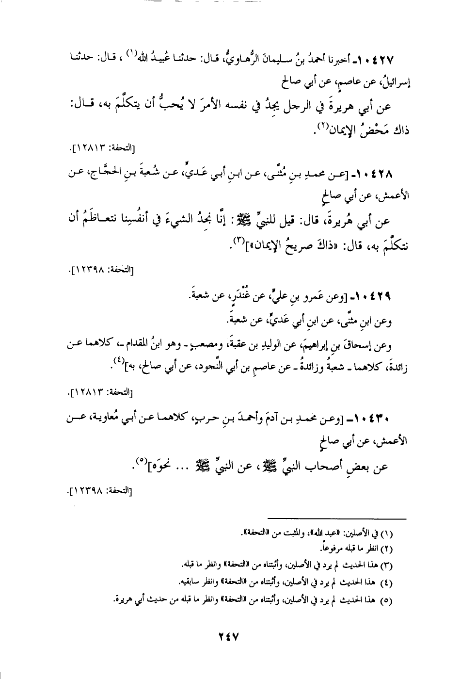 10427 - أَخْبَرَنَا أَحْمَدُ بْنُ سُلَيْمَانَ الرُّهَاوِيُّ، قَالَ: حَدَّثَنَا عُبَيْدُ اللهِ، قَالَ: حَدَّثَنَا إِسْرَائِيلُ، عَنْ عَاصِمٍ، عَنْ أَبِي صَالِحٍ، عَنْ أَبِي هُرَيْرَةَ، فِي الرَّجُلِ يَجِدُ فِي نَفْسِهِ الْأَمْرَ لَا يُحِبُّ أَنْ يَتَكَلَّمَ بِهِ قَالَ: «§ذَاكَ مَحْضُ الْإِيمَانِ»