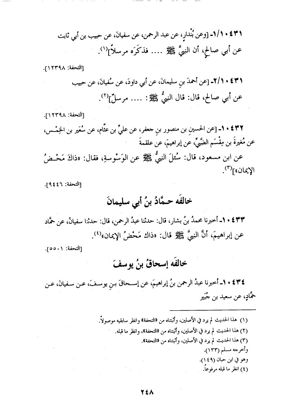 10433 - أَخْبَرَنَا مُحَمَّدُ بْنُ بَشَّارٍ، قَالَ: حَدَّثَنَا عَبْدُ الرَّحْمَنِ، قَالَ: حَدَّثَنَا سُفْيَانُ، عَنْ حَمَّادٍ، عَنْ إِبْرَاهِيمَ، أَنَّ النَّبِيَّ صَلَّى اللهُ عَلَيْهِ وَسَلَّمَ قَالَ: «§ذَاكَ مَحْضُ الْإِيمَانِ» خَالَفَهُ إِسْحَاقُ بْنُ يُوسُفَ