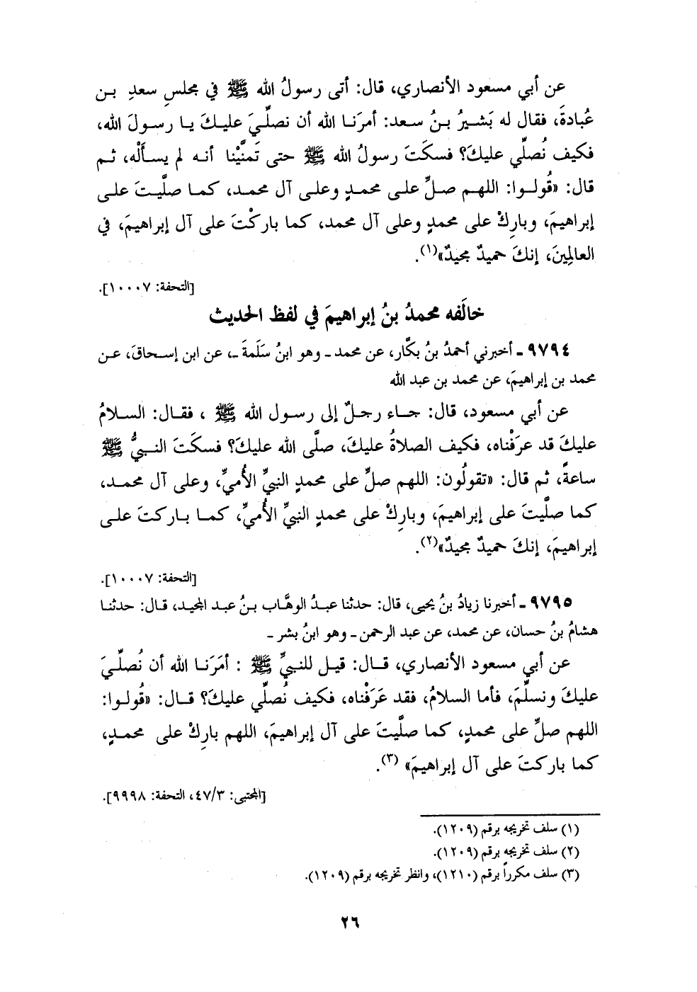 9794 - أَخْبَرَنِي أَحْمَدُ بْنُ بَكَّارٍ، عَنْ مُحَمَّدٍ وَهُوَ ابْنُ سَلَمَةَ، عَنِ ابْنِ إِسْحَاقَ، عَنْ مُحَمَّدِ بْنِ إِبْرَاهِيمَ، عَنْ مُحَمَّدِ بْنِ عَبْدِ اللهِ، عَنْ أَبِي مَسْعُودٍ قَالَ: جَاءَ رَجُلٌ إِلَى رَسُولِ اللهِ صَلَّى اللهُ عَلَيْهِ وَسَلَّمَ فَقَالَ: السَّلَامُ عَلَيْكَ قَدْ عَرَفْنَاهُ، فَكَيْفَ الصَّلَاةُ عَلَيْكَ صَلَّى الله عَلَيْكَ؟ فَسَكَتَ النَّبِيُّ صَلَّى اللهُ عَلَيْهِ وَسَلَّمَ سَاعَةً ثُمَّ قَالَ: " §تَقُولُونَ: اللهُمَّ صَلِّ عَلَى مُحَمَّدٍ النَّبِيِّ الْأُمِّيِّ، وَعَلَى آلِ مُحَمَّدٍ، كَمَا صَلَّيْتَ عَلَى إِبْرَاهِيمَ، وَبَارِكْ عَلَى مُحَمَّدٍ النَّبِيِّ الْأُمِّيِّ، كَمَا بَارَكْتَ عَلَى إِبْرَاهِيمَ، إِنَّكَ حَمِيدٌ مَجِيدٌ "