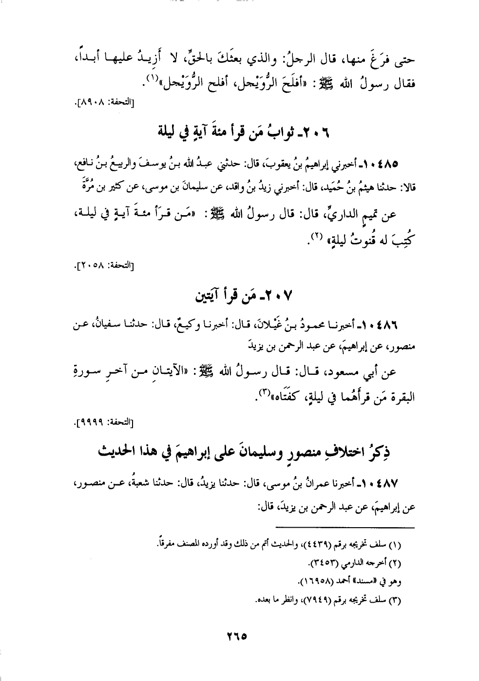 10485 - أَخْبَرَنِي إِبْرَاهِيمُ بْنُ يَعْقُوبَ، قَالَ: حَدَّثَنِي عَبْدُ اللهِ بْنُ يُوسُفَ، وَالرَّبِيعُ بْنُ نَافِعٍ، قَالَا: حَدَّثَنَا هَيْثَمُ بْنُ حُمَيْدٍ، قَالَ: أَخْبَرَنِي زَيْدُ بْنُ وَاقِدٍ، عَنْ سُلَيْمَانَ بْنِ مُوسَى، عَنْ كَثِيرِ بْنِ مُرَّةَ، عَنْ تَمِيمٍ الدَّارِيِّ، قَالَ: قَالَ رَسُولُ اللهِ صَلَّى اللهُ عَلَيْهِ وَسَلَّمَ: «§مَنْ قَرَأَ مِائَةَ آيَةٍ فِي لَيْلَةٍ كُتِبَ لَهُ قُنُوتُ لَيْلَةٍ»