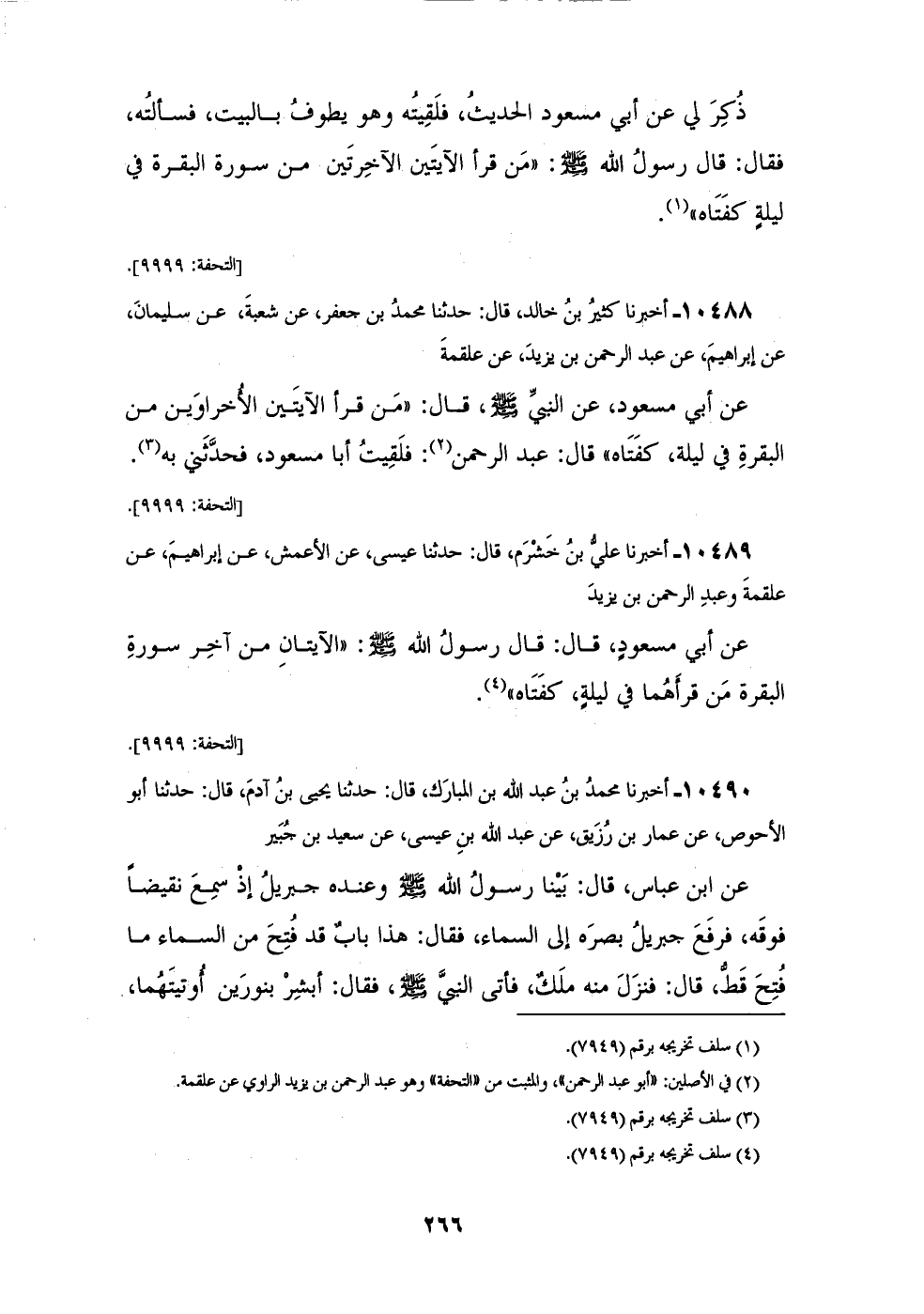 10488 - أَخْبَرَنَا بِشْرُ بْنُ خَالِدٍ، قَالَ: حَدَّثَنَا مُحَمَّدُ بْنُ جَعْفَرٍ، عَنْ شُعْبَةَ، عَنْ سُلَيْمَانَ، عَنْ إِبْرَاهِيمَ، عَنْ عَبْدِ الرَّحْمَنِ بْنِ يَزِيدَ، عَنْ عَلْقَمَةَ، عَنْ أَبِي مَسْعُودٍ عَنِ النَّبِيِّ صَلَّى اللهُ عَلَيْهِ وَسَلَّمَ قَالَ: «§مَنْ قَرَأَ الْآيَتَيْنِ الْأُخْرَاوَيْنِ مِنَ الْبَقَرَةِ فِي لَيْلَةٍ كَفَتَاهُ» قَالَ عَبْدُ الرَّحْمَنِ: فَلَقِيتُ أَبَا مَسْعُودٍ فَحَدَّثَنِي بِهِ