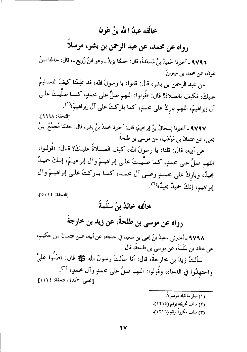 9797 - أَخْبَرَنَا إِسْحَاقُ بْنُ إِبْرَاهِيمَ قَالَ: أَخْبَرَنَا مُحَمَّدُ بْنُ بِشْرٍ قَالَ: حَدَّثَنَا مُجَمِّعُ بْنُ يَحْيَى، عَنْ عُثْمَانَ بْنِ مَوْهَبٍ، عَنْ مُوسَى بْنِ طَلْحَةَ، عَنْ أَبِيهِ قَالَ: قُلْنَا: يَا رَسُولَ اللهِ، كَيْفَ الصَّلَاةُ عَلَيْكَ؟ قَالَ: " §قُولُوا: اللهُمَّ صَلِّ عَلَى مُحَمَّدٍ، كَمَا صَلَّيْتَ عَلَى إِبْرَاهِيمَ وَآلِ إِبْرَاهِيمَ، إِنَّكَ حَمِيدٌ مَجِيدٌ، وَبَارِكْ عَلَى مُحَمَّدٍ وَعَلَى آلِ مُحَمَّدٍ، كَمَا بَارَكْتَ عَلَى إِبْرَاهِيمَ وَآلِ إِبْرَاهِيمَ، إِنَّكَ حَمِيدٌ مَجِيدٌ ". خَالَفَهُ خَالِدُ بْنُ سَلَمَةَ، رَوَاهُ عَنْ مُوسَى بْنِ طَلْحَةَ، عَنْ زَيْدِ بْنِ خَارِجَةَ