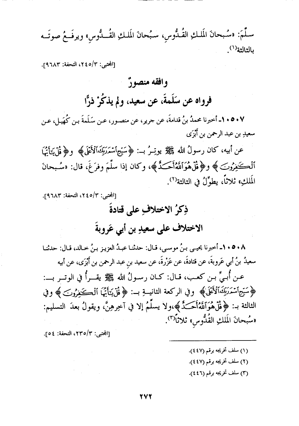 10508 - أَخْبَرَنَا يَحْيَى بْنُ مُوسَى، قَالَ: حَدَّثَنَا عَبْدُ الْعَزِيزِ بْنُ خَالِدٍ، قَالَ: حَدَّثَنَا سَعِيدُ بْنُ أَبِي عَرُوبَةَ، عَنْ قَتَادَةَ، عَنْ عَزْرَةَ، عَنْ سَعِيدِ بْنِ عَبْدِ الرَّحْمَنِ بْنِ أَبْزَى، عَنْ أَبِيهِ، عَنْ أُبَيِّ بْنِ كَعْبٍ، قَالَ: كَانَ رَسُولُ اللهِ صَلَّى اللهُ عَلَيْهِ وَسَلَّمَ يَقْرَأُ فِي الْوِتْرِ بِسَبِّحِ اسْمَ رَبِّكَ الْأَعْلَى وَفِي الرَّكْعَةِ الثَّانِيَةِ بِقُلْ يَا أَيُّهَا الْكَافِرُونَ وَفِي الثَّالِثَةِ بِقُلْ هُوَ اللهُ أَحَدٌ وَلَا يُسَلِّمُ إِلَّا فِي آخِرِهِنَّ وَيَقُولُ بَعْدَ التَّسْلِيمِ: «§سُبْحَانَ الْمَلِكِ الْقُدُّوسِ» ثَلَاثًا -[273]-، خَالَفَهُ عَبْدُ الْعَزِيزِ بْنُ عَبْدِ الصَّمَدِ وَمُحَمَّدُ بْنُ بِشْرٍ