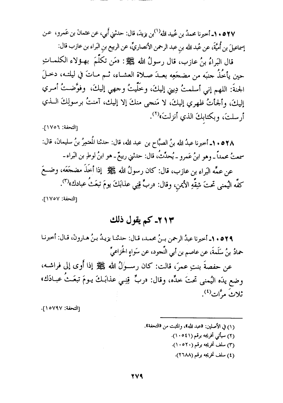 10527 - أَخْبَرَنَا مُحَمَّدُ بْنُ عُبَيْدِ اللهِ بْنِ يَزِيدَ، قَالَ: حَدَّثَنِي أَبِي، عَنْ عُثْمَانَ بْنِ عَمْرٍو، عَنْ إِسْمَاعِيلَ بْنِ أُمَيَّةَ، عَنْ عَبْدِ اللهِ بْنِ عَبْدِ الرَّحْمَنِ الْأَنْصَارِيِّ، عَنِ الرَّبِيعِ بْنِ الْبَرَاءِ بْنِ عَازِبٍ، قَالَ: قَالَ الْبَرَاءُ بْنُ عَازِبٍ: قَالَ رَسُولُ اللهِ صَلَّى اللهُ عَلَيْهِ وَسَلَّمَ: " §مَنْ تَكَلَّمَ بِهَؤُلَاءِ الْكَلِمَاتِ حِينَ يَأْخُذُ جَنْبَهُ مِنْ مَضْجَعِهِ بَعْدَ صَلَاةِ الْعِشَاءِ ثُمَّ مَاتَ فِي لَيْلَتِهِ دَخَلَ الْجَنَّةَ: اللهُمَّ إِنِّي أَسْلَمْتُ دِينِي إِلَيْكَ، وَخَلَّيْتُ وَجْهِي إِلَيْكَ، وَفَوَّضْتُ أَمْرِي إِلَيْكَ، وَالْجَأْتُ ظَهْرِي إِلَيْكَ، لَا مَنْجَى مِنْكَ إِلَّا إِلَيْكَ، آمَنْتُ بِرَسُولِكَ الَّذِي أَرْسَلْتَ، وَبِكِتَابِكَ الَّذِي أَنْزَلْتَ "