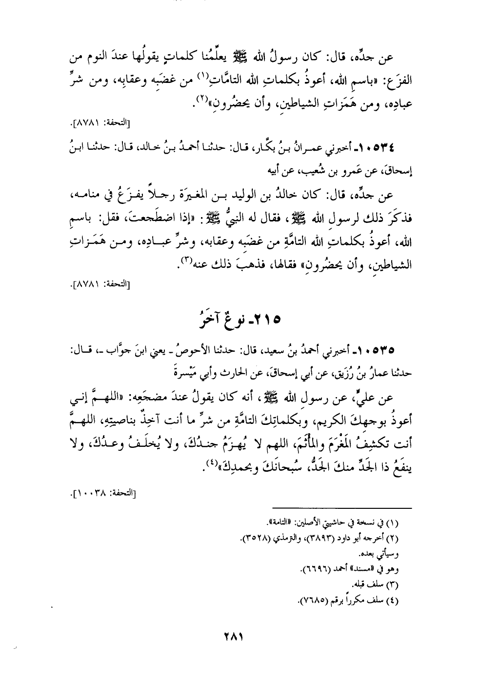 10534 - أَخْبَرَنِي عِمْرَانُ بْنُ بَكَّارٍ، قَالَ: حَدَّثَنَا أَحْمَدُ بْنُ خَالِدٍ، قَالَ: حَدَّثَنَا ابْنُ إِسْحَاقَ، عَنْ عَمْرِو بْنِ شُعَيْبٍ، عَنْ أَبِيهِ، عَنْ جَدِّهِ، قَالَ: كَانَ خَالِدُ بْنُ الْوَلِيدِ بْنِ الْمُغِيرَةِ رَجُلًا يَفْزَعُ فِي مَنَامِهِ، فَذَكَرَ ذَلِكَ لِرَسُولِ اللهِ صَلَّى اللهُ عَلَيْهِ وَسَلَّمَ فَقَالَ لَهُ النَّبِيُّ صَلَّى اللهُ عَلَيْهِ وَسَلَّمَ: " إِذَا §اضْطَجَعْتَ فَقُلْ: بِاسْمِ اللهِ، أَعُوذُ بِكَلِمَاتِ اللهِ التَّامَّةِ، مِنْ غَضَبِهِ وَعِقَابِهِ، وَشَرِّ عِبَادِهِ، وَمِنْ هَمَزَاتِ الشَّيَاطِينِ، وَأَنْ يَحْضُرُونِ " فَقَالَهَا فَذَهَبَ ذَلِكَ عَنْهُ