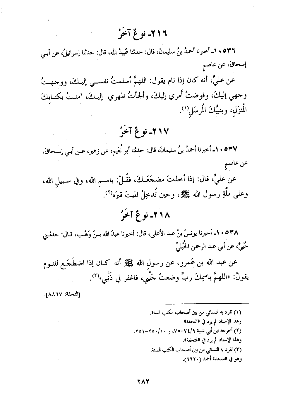 10536 - أَخْبَرَنَا أَحْمَدُ بْنُ سُلَيْمَانَ، قَالَ: حَدَّثَنَا عُبَيْدُ اللهِ، قَالَ: حَدَّثَنَا إِسْرَائِيلُ، عَنْ أَبِي إِسْحَاقَ، عَنْ عَاصِمٍ، عَنْ عَلِيٍّ، أَنَّهُ كَانَ إِذَا نَامَ يَقُولُ: «§اللهُمَّ أَسْلَمْتُ نَفْسِي إِلَيْكَ، وَوَجَّهْتُ وَجْهِي إِلَيْكَ، وَفَوَّضْتُ أَمْرِي إِلَيْكَ، وَأَلْجَأْتُ ظَهْرِي إِلَيْكَ، آمَنْتُ بِكِتَابِكَ الْمُنَزَّلِ، وَبِنَبِيِّكَ الْمُرْسَلِ»