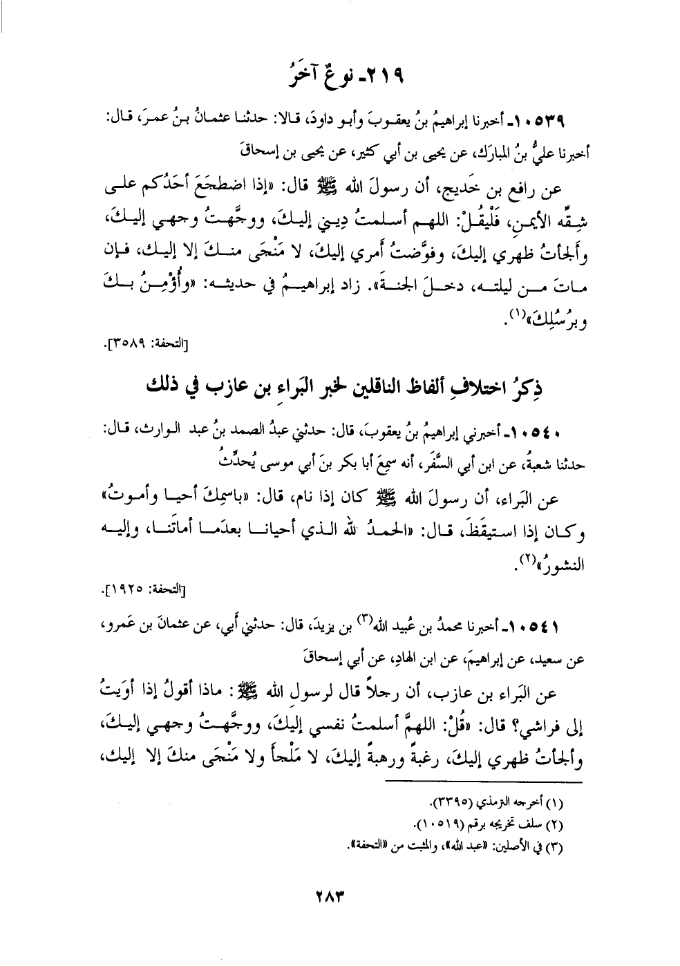 10539 - أَخْبَرَنَا إِبْرَاهِيمُ بْنُ يَعْقُوبَ، وَأَبُو دَاوُدَ، قَالَا: حَدَّثَنَا عُثْمَانُ بْنُ عُمَرَ، قَالَ: أَخْبَرَنَا عَلِيُّ بْنُ الْمُبَارَكِ، عَنْ يَحْيَى بْنِ أَبِي كَثِيرٍ، عَنْ يَحْيَى بْنِ إِسْحَاقَ، عَنْ رَافِعِ بْنِ خَدِيجٍ، أَنَّ رَسُولَ اللهِ صَلَّى اللهُ عَلَيْهِ وَسَلَّمَ قَالَ: " إِذَا §اضْطَجَعَ أَحَدُكُمْ عَلَى شِقِّهِ الْأَيْمَنِ فَلْيَقُلِ: اللهُمَّ إِنِّي أَسْلَمْتُ دِينِي إِلَيْكَ، وَوَجَّهْتُ وَجْهِي إِلَيْكَ، وَأَلْجَأْتُ ظَهْرِي إِلَيْكَ، وَفَوَّضْتُ أَمْرِي إِلَيْكَ، لَا مَنْجَى مِنْكَ إِلَّا إِلَيْكَ، فَإِنْ مَاتَ مِنْ لَيْلَتِهِ دَخَلَ الْجَنَّةَ " زَادَ إِبْرَاهِيمُ فِي حَدِيثِهِ: «وَأُؤمِنُ بِكَ وَبِرُسُلِكَ»