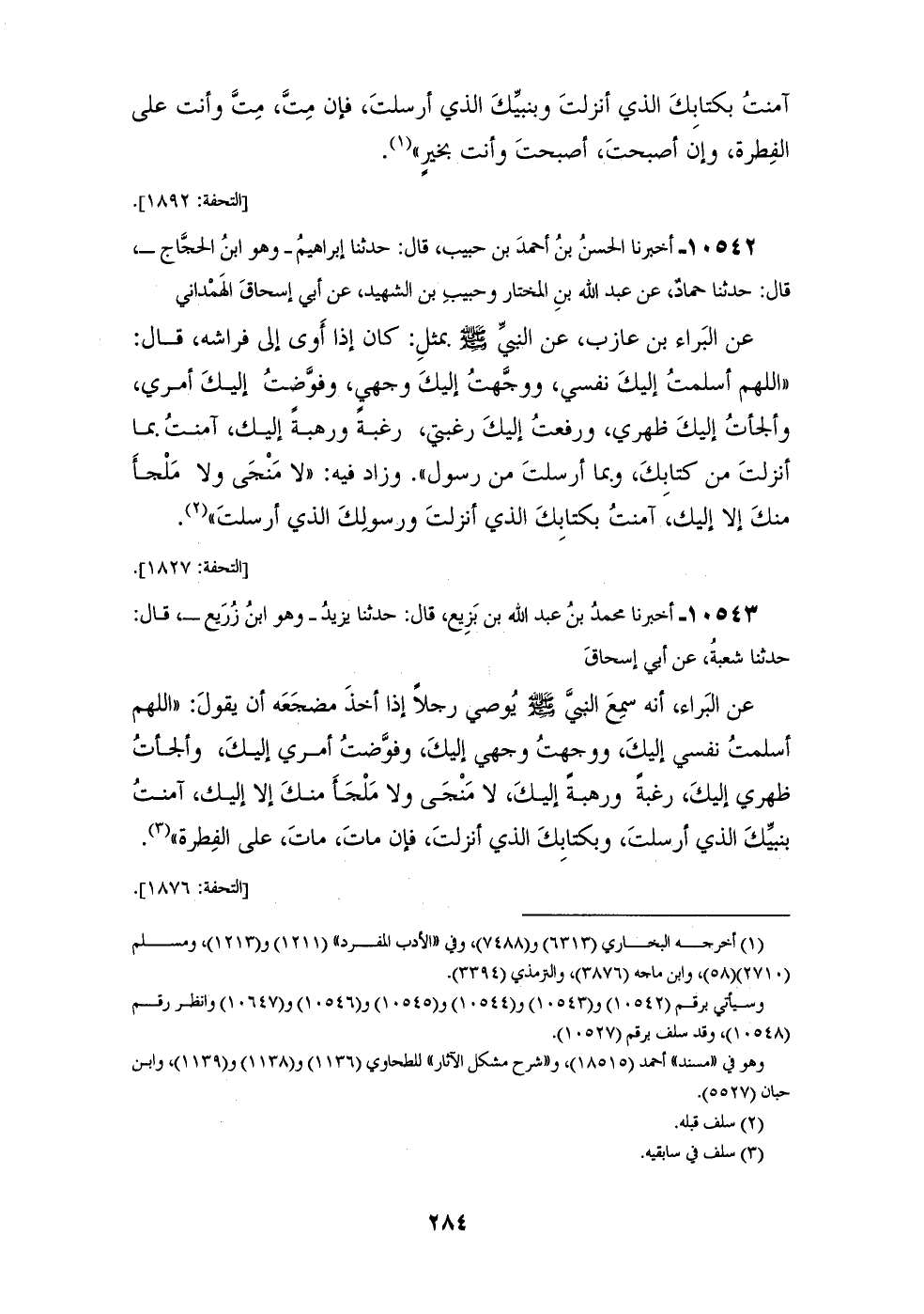 10542 - أَخْبَرَنَا الْحَسَنُ بْنُ أَحْمَدَ بْنِ حَبِيبٍ، قَالَ: حَدَّثَنَا إِبْرَاهِيمُ وَهُوَ ابْنُ الْحَجَّاجِ، قَالَ: حَدَّثَنَا حَمَّادٌ، عَنْ عَبْدِ اللهِ بْنِ الْمُخْتَارِ، وَحَبِيبُ بْنُ الشَّهِيدِ، عَنْ أَبِي إِسْحَاقَ الْهَمْدَانِيِّ، عَنِ الْبَرَاءِ بْنِ عَازِبٍ عَنِ النَّبِيِّ صَلَّى اللهُ عَلَيْهِ وَسَلَّمَ بِمِثْلِ: كَانَ إِذَا أَوَى إِلَى فِرَاشِهِ قَالَ: «§اللهُمَّ أَسْلَمْتُ إِلَيْكَ نَفْسِي، وَوَجَّهْتُ إِلَيْكَ وَجْهِي، وَفَوَّضْتُ إِلَيْكَ أَمْرِي، وَأَلْجَأْتُ إِلَيْكَ ظَهْرِي، وَرَفَعْتُ إِلَيْكَ رَغْبَتِي، رَغْبَةً وَرَهْبَةً إِلَيْكَ، آمَنْتُ بِمَا أَنْزَلْتَ مِنْ كِتَابٍ، وَبِمَا أَرْسَلْتَ مِنْ رَسُولٍ» وَزَادَ فِيهِ: «لَا مَنْجَى وَلَا مَلْجَأَ مِنْكَ إِلَّا إِلَيْكَ، آمَنْتُ بِكِتَابِكَ الَّذِي أَنْزَلْتَ، وَرَسُولِكَ الَّذِي أَرْسَلْتَ»