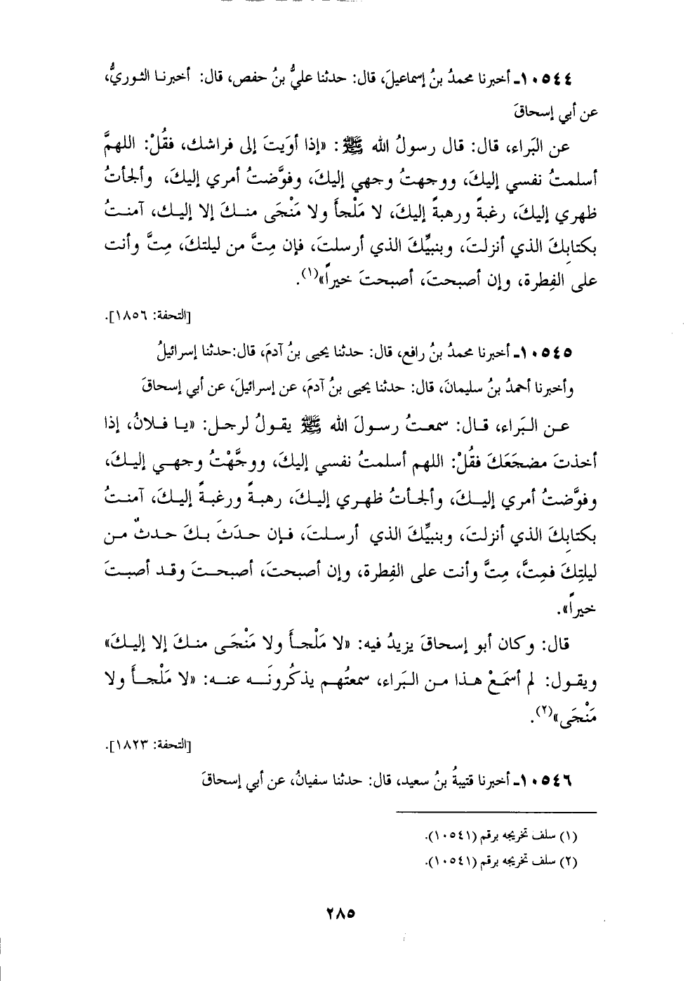 10545 - أَخْبَرَنَا مُحَمَّدُ بْنُ رَافِعٍ، قَالَ: حَدَّثَنَا يَحْيَى بْنُ آدَمَ، قَالَ: حَدَّثَنَا إِسْرَائِيلُ، وَأَخْبَرَنَا أَحْمَدُ بْنُ سُلَيْمَانَ، قَالَ: حَدَّثَنَا يَحْيَى بْنُ آدَمَ، عَنْ إِسْرَائِيلَ، عَنْ أَبِي إِسْحَاقَ، عَنِ الْبَرَاءِ، قَالَ: سَمِعْتُ رَسُولَ اللهِ صَلَّى اللهُ عَلَيْهِ وَسَلَّمَ يَقُولُ لِرَجُلٍ: " يَا فُلَانُ، إِذَا §أَخَذْتَ مَضْجَعَكَ فَقُلِ: اللهُمَّ أَسْلَمْتُ نَفْسِي إِلَيْكَ، وَوَجَّهْتُ وَجْهِي إِلَيْكَ، وَفَوَّضْتُ أَمْرِي إِلَيْكَ، وَأَلْجَأْتُ ظَهْرِي إِلَيْكَ، رَهْبَةً وَرَغْبَةً إِلَيْكَ، آمَنْتُ بِكِتَابِكَ الَّذِي أَنْزَلْتَ، وَبِنَبِيِّكَ الَّذِي أَرْسَلْتَ، فَإِنْ حَدَثَ بِكَ حَدَثٌ مِنْ لَيْلَتِكَ فَمُتَّ مُتَّ وَأَنْتَ عَلَى الْفِطْرَةِ، وَإِنْ أَصْبَحْتَ أَصْبَحْتَ وَقَدْ أَصَبْتَ خَيْرًا " قَالَ: وَكَانَ أَبُو إِسْحَاقَ يَزِيدُ فِيهِ: «لَا مَلْجَأَ وَلَا مَنْجَى مِنْكَ إِلَّا إِلَيْكَ» وَيَقُولُ: لَمْ أَسْمَعْ هَذَا مِنَ الْبَرَاءِ سَمِعْتُهُمْ يَذْكُرُونَهُ عَنْهُ «لَا مَلْجَأَ وَلَا مَنْجَى»