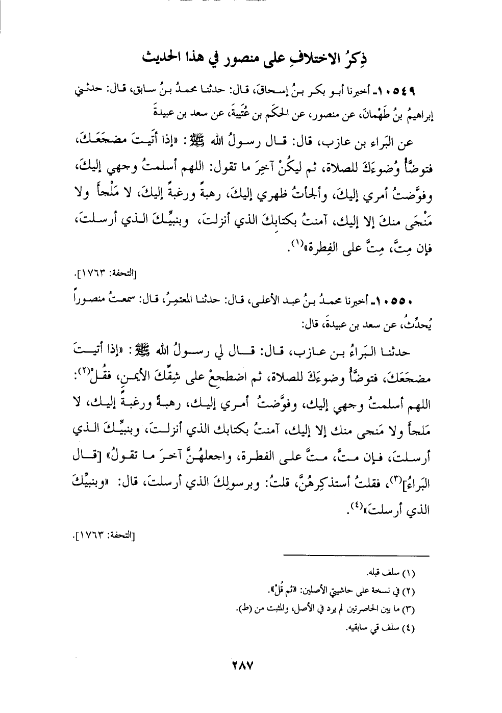10549 - أَخْبَرَنَا أَبُو بَكْرِ بْنُ إِسْحَاقَ، قَالَ: حَدَّثَنَا مُحَمَّدُ بْنُ سَابِقٍ، قَالَ: حَدَّثَنِي إِبْرَاهِيمُ بْنُ طَهْمَانَ، عَنْ مَنْصُورٍ، عَنِ الْحَكَمِ بْنِ عُتَيْبَةَ، عَنْ سَعْدِ بْنِ عُبَيْدَةَ، عَنِ الْبَرَاءِ بْنِ عَازِبٍ، قَالَ: قَالَ رَسُولُ اللهِ صَلَّى اللهُ عَلَيْهِ وَسَلَّمَ: " إِذَا §أَتَيْتَ مَضْجَعَكَ فَتَوَضَّأْ وُضُوءَكَ لِلصَّلَاةِ، ثُمَّ لِيَكُنْ آخِرَ مَا تَقُولُ: اللهُمَّ أَسْلَمْتُ وَجْهِي إِلَيْكَ، وَفَوَّضْتُ أَمْرِي إِلَيْكَ، وَأَلْجَأْتُ ظَهْرِي إِلَيْكَ، رَهْبَةً وَرَغْبَةً إِلَيْكَ، لَا مَلْجَأَ وَلَا مَنْجَى مِنْكَ إِلَّا إِلَيْكَ، آمَنْتُ بِكِتَابِكَ الَّذِي أَنْزَلْتَ، وَبِنَبِيِّكَ الَّذِي أَرْسَلْتَ، فَإِنْ مُتَّ مُتَّ عَلَى الْفِطْرَةِ "