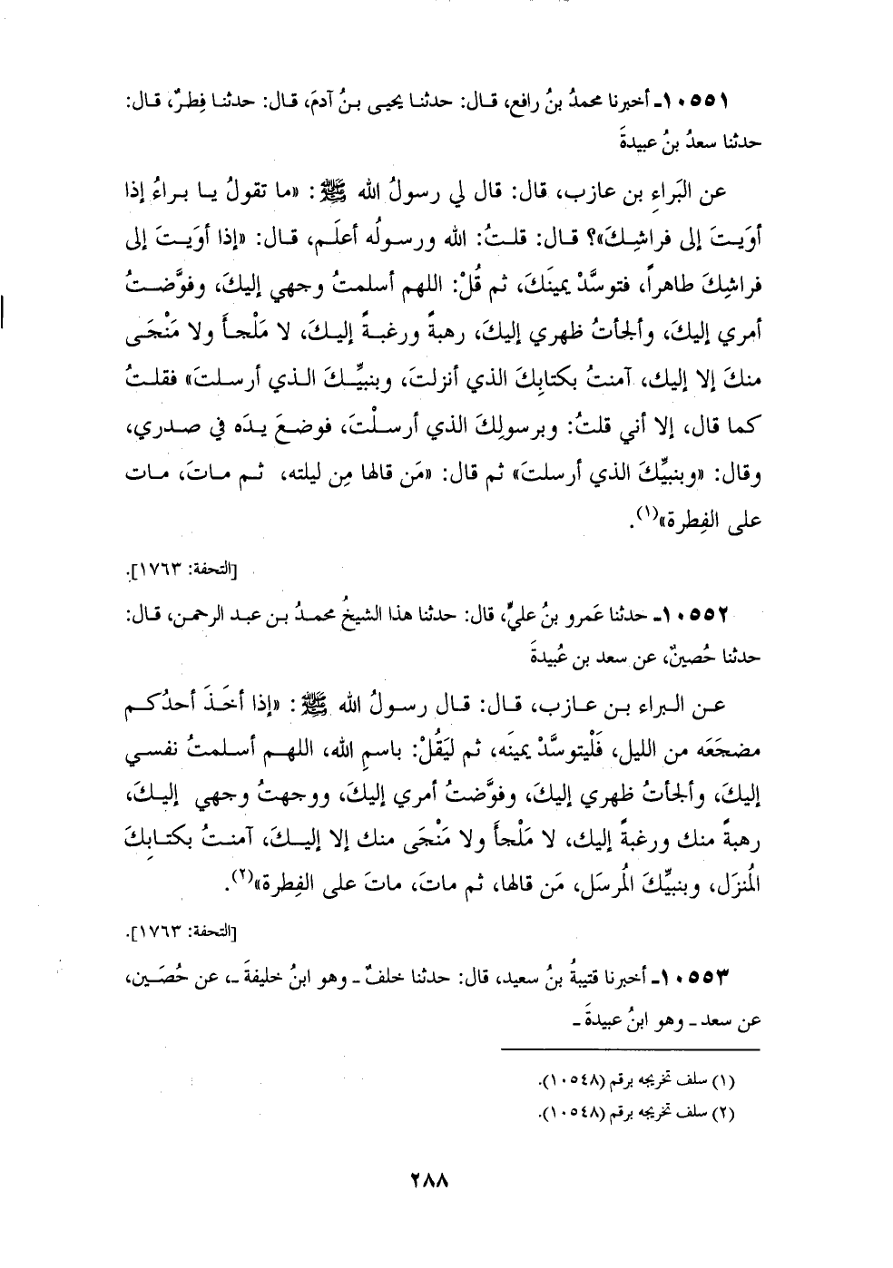 10552 - حَدَّثَنَا عَمْرُو بْنُ عَلِيٍّ، قَالَ: حَدَّثَنَا هَذَا الشَّيْخُ مُحَمَّدُ بْنُ عَبْدِ الرَّحْمَنِ، قَالَ: حَدَّثَنَا حُصَيْنٌ، عَنْ سَعْدِ بْنِ عُبَيْدَةَ، عَنِ الْبَرَاءِ بْنِ عَازِبٍ، قَالَ: قَالَ رَسُولُ اللهِ صَلَّى اللهُ عَلَيْهِ وَسَلَّمَ: " إِذَا §أَخَذَ أَحَدُكُمْ مَضْجَعَهُ مِنَ اللَّيْلِ فَلْيَتَوَسَّدْ يَمِينَهُ ثُمَّ لِيَقُلْ: بِاسْمِ اللهِ، اللهُمَّ أَسْلَمْتُ نَفْسِي إِلَيْكَ، وَأَلْجَأْتُ ظَهْرِي إِلَيْكَ، وَفَوَّضْتُ أَمْرِي إِلَيْكَ، وَوَجَّهْتُ وَجْهِي إِلَيْكَ، رَهْبَةً مِنْكَ وَرَغْبَةً إِلَيْكَ، لَا مَلْجَأَ وَلَا مَنْجَى مِنْكَ إِلَّا إِلَيْكَ، آمَنْتُ بِكِتَابِكَ الْمَنْزِلِ، وَبِنَبِيِّكَ الْمُرْسَلِ، مَنْ قَالَهَا ثُمَّ مَاتَ مَاتَ عَلَى الْفِطْرَةِ "