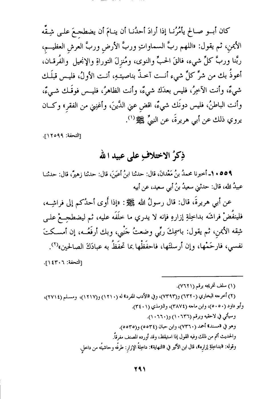 10559 - أَخْبَرَنَا مُحَمَّدُ بْنُ مَعْدَانَ، قَالَ: حَدَّثَنَا ابْنُ أَعْيَنَ، قَالَ: حَدَّثَنَا زُهَيْرٌ، قَالَ: حَدَّثَنَا عُبَيْدُ اللهِ، قَالَ: حَدَّثَنِي سَعِيدُ بْنُ أَبِي سَعِيدٍ، عَنْ أَبِيهِ، عَنْ أَبِي هُرَيْرَةَ، قَالَ: قَالَ رَسُولُ اللهِ صَلَّى اللهُ عَلَيْهِ وَسَلَّمَ: " إِذَا §أَوَى أَحَدُكُمْ إِلَى فِرَاشِهِ فَلْيَنْفُضْ فِرَاشَهُ بِدَاخِلَةِ إِزَارِهِ، فَإِنَّهُ لَا يَدْرِي مَا خَلَفَهُ عَلَيْهِ، ثُمَّ لِيَضْطَجِعْ عَلَى شِقِّهِ الْأَيْمَنِ ثُمَّ يَقُولُ: بِاسْمِكَ رَبِّي وَضَعْتُ جَنْبِي، وَبِكَ أَرْفَعُهُ، إِنْ أَمْسَكْتَ نَفْسِي فَارْحَمْهَا، وَإِنْ أَرْسَلْتَهَا، فَاحْفَظْهَا بِمَا تَحْفَظُ بِهِ عِبَادَكَ الصَّالِحِينَ "