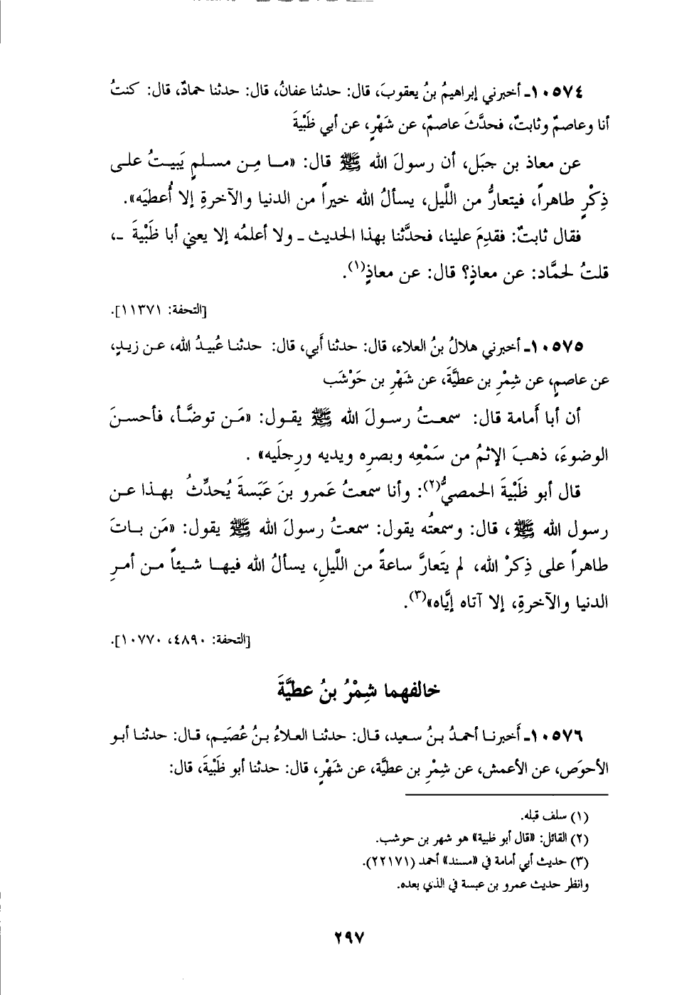 10575 - أَخْبَرَنِي هِلَالُ بْنُ الْعَلَاءِ، قَالَ: حَدَّثَنَا أَبِي قَالَ: حَدَّثَنَا عُبَيْدُ اللهِ، عَنْ زَيْدٍ، عَنْ عَاصِمٍ، عَنْ شَمِرِ بْنِ عَطِيَّةَ، عَنْ شَهْرِ بْنِ حَوْشَبٍ: أَنَّ أَبَا أُمَامَةَ، قَالَ: سَمِعْتُ رَسُولَ اللهِ صَلَّى اللهُ عَلَيْهِ وَسَلَّمَ يَقُولُ: «§مَنْ تَوَضَّأَ فَأَحْسَنَ الْوُضُوءَ ذَهَبَ الْإِثْمُ مِنْ سَمْعِهِ، وَبَصَرِهِ، وَيَدَيْهِ، وَرِجْلَيْهِ» قَالَ أَبُو ظَبْيَةَ الْحِمْصِيُّ: وَأَنَا سَمِعْتُ عَمْرَو بْنَ عَبَسَةَ يُحَدِّثُ بِهَذَا، عَنْ رَسُولِ اللهِ صَلَّى اللهُ عَلَيْهِ وَسَلَّمَ، قَالَ: وَسَمِعْتُهُ يَقُولُ: سَمِعْتُ رَسُولَ اللهِ صَلَّى اللهُ عَلَيْهِ وَسَلَّمَ يَقُولُ: «مَنْ بَاتَ طَاهِرًا عَلَى ذِكْرِ اللهِ لَمْ يَتَعَارَّ سَاعَةً مِنَ اللَّيْلِ يَسْأَلُ اللهَ فِيهَا شَيْئًا مِنْ أَمْرِ الدُّنْيَا وَالْآخِرَةِ إِلَّا آتَاهُ إِيَّاهُ» -[298]- خَالَفَهُمَا شَمِرُ بْنُ عَطِيَّةَ
