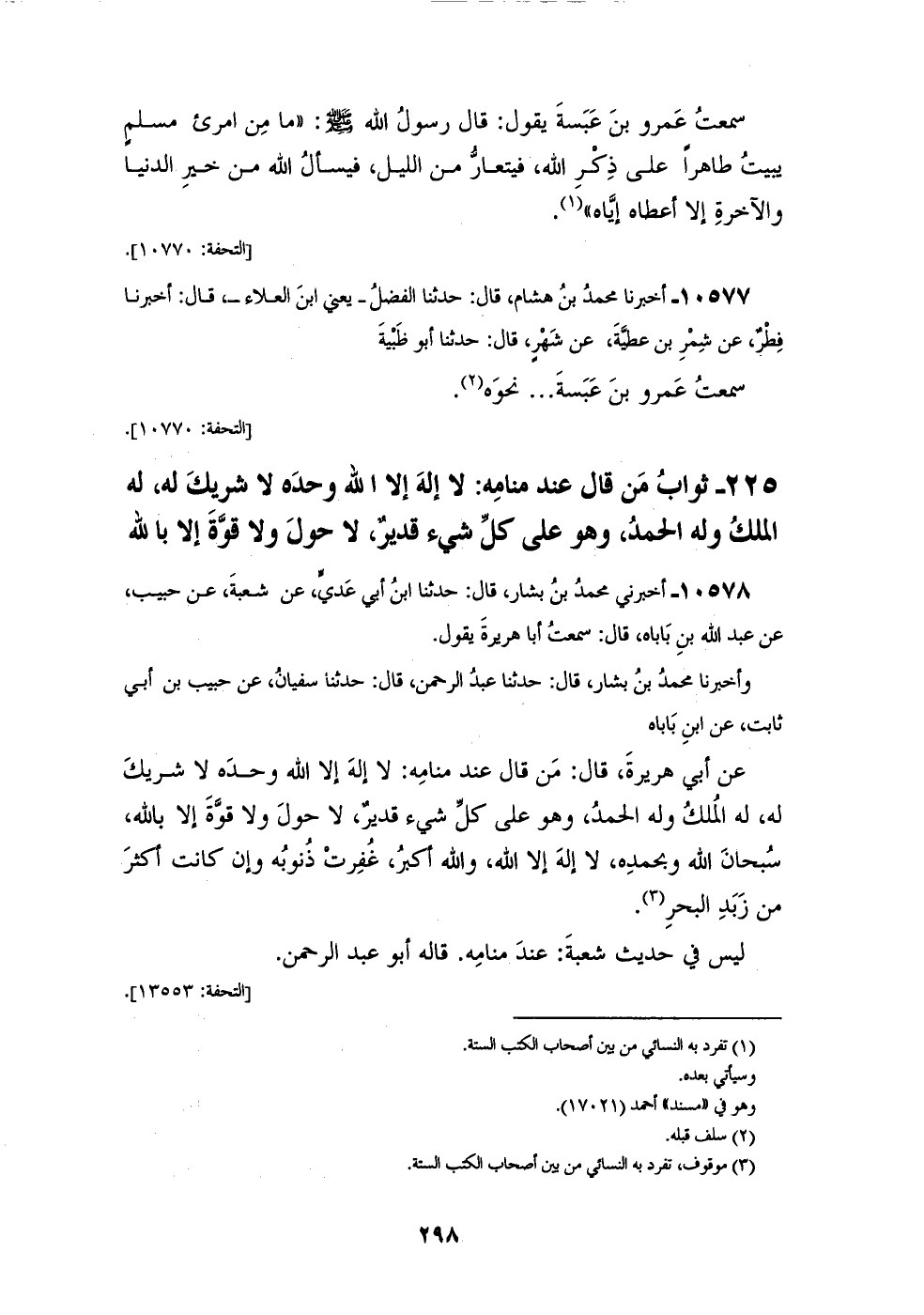 10576 - أَخْبَرَنَا أَحْمَدُ بْنُ سَعِيدٍ، قَالَ: حَدَّثَنَا الْعَلَاءُ بْنُ عُصَيْمٍ، قَالَ: حَدَّثَنَا أَبُو الْأَحْوَصِ، عَنِ الْأَعْمَشِ، عَنْ شَمِرِ بْنِ عَطِيَّةَ، عَنْ شَهْرٍ، قَالَ: حَدَّثَنَا أَبُو ظَبْيَةَ، قَالَ: سَمِعْتُ عَمْرَو بْنَ عَبَسَةَ، يَقُولُ: قَالَ رَسُولُ اللهِ صَلَّى اللهُ عَلَيْهِ وَسَلَّمَ: «§مَا مِنَ امْرِئٍ مُسْلِمٍ يَبِيتُ طَاهِرًا عَلَى ذِكْرِ اللهِ، فَيَتَعَارَّ مِنَ اللَّيْلِ، فَيَسْأَلُ اللهَ مِنْ خَيْرِ الدُّنْيَا وَالْآخِرَةِ إِلَّا أَعْطَاهُ إِيَّاهُ»