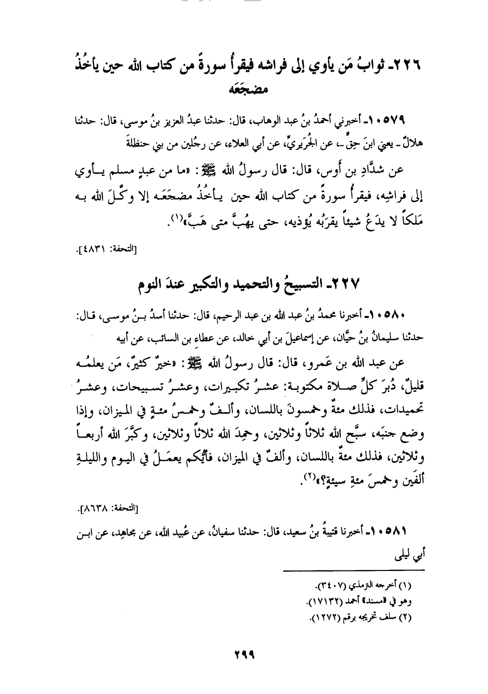 §ثَوَابُ مَنْ يَأْوِي إِلَى فِرَاشِهِ، فَيَقْرَأُ سُورَةً مِنْ كِتَابِ اللهِ حِينَ يَأْخُذُ مَضْجَعَهُ