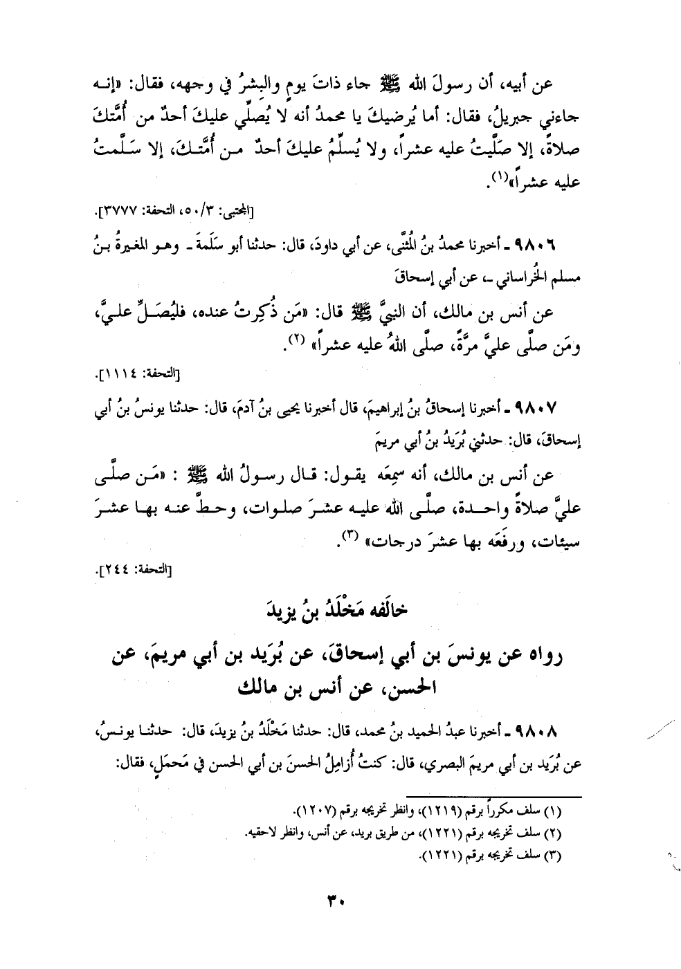 9807 - أَخْبَرَنَا إِسْحَاقُ بْنُ إِبْرَاهِيمَ قَالَ: أَخْبَرَنَا يَحْيَى بْنُ آدَمَ قَالَ: حَدَّثَنَا يُونُسُ بْنُ أَبِي إِسْحَاقَ قَالَ: حَدَّثَنِي بُرَيْدُ بْنُ أَبِي مَرْيَمَ، عَنْ أَنَسِ بْنِ مَالِكٍ: أَنَّهُ سَمِعَهُ يَقُولُ: قَالَ رَسُولُ اللهِ صَلَّى اللهُ عَلَيْهِ وَسَلَّمَ: «مَنْ §صَلَّى عَلَيَّ صَلَاةً وَاحِدَةً صَلَّى الله عَلَيْهِ عَشْرَ صَلَوَاتٍ، وَحَطَّ عَنْهُ بِهَا عَشْرَ سَيِّئَاتٍ، وَرَفَعَهُ بِهَا عَشْرَ دَرَجَاتٍ» خَالَفَهُ مَخْلَدُ بْنُ يَزِيدَ، رَوَاهُ عَنْ يُونُسَ بْنِ أَبِي إِسْحَاقَ، عَنْ بُرَيْدِ بْنِ أَبِي مَرْيَمَ، عَنِ الْحَسَنِ، عَنْ أَنَسِ بْنِ مَالِكٍ