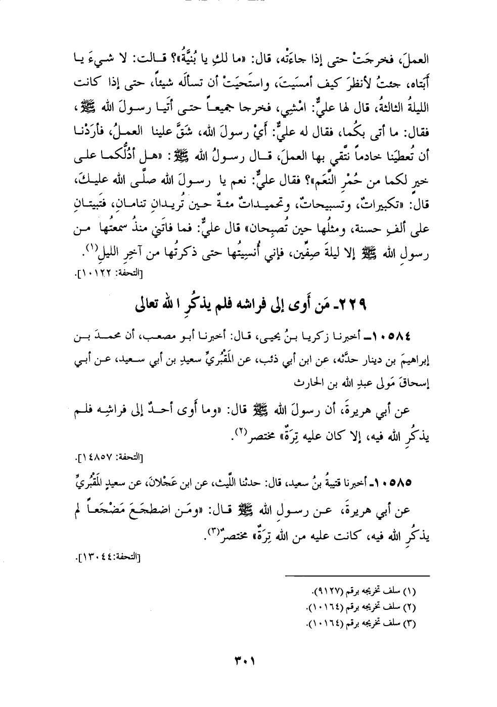 10584 - أَخْبَرَنَا زَكَرِيَّا بْنُ يَحْيَى، قَالَ: أَخْبَرَنَا أَبُو مُصْعَبٍ، أَنَّ مُحَمَّدَ بْنَ إِبْرَاهِيمَ بْنِ دِينَارٍ، حَدَّثَهٌ، عَنِ ابْنِ أَبِي ذِئْبٍ، عَنِ الْمَقْبُرِيِّ سَعِيدِ بْنِ أَبِي سَعِيدٍ، عَنْ أَبِي إِسْحَاقَ، مَوْلَى عَبْدِ اللهِ بْنِ الْحَارِثِ، عَنْ أَبِي هُرَيْرَةَ، أَنَّ رَسُولَ اللهِ صَلَّى اللهُ عَلَيْهِ وَسَلَّمَ قَالَ: «§وَمَا أَوَى أَحَدٌ إِلَى فِرَاشِهِ، فَلَمْ يَذْكُرِ اللهَ فِيهِ إِلَّا كَانَ عَلَيْهِ تِرَةٌ» مُخْتَصَرٌ