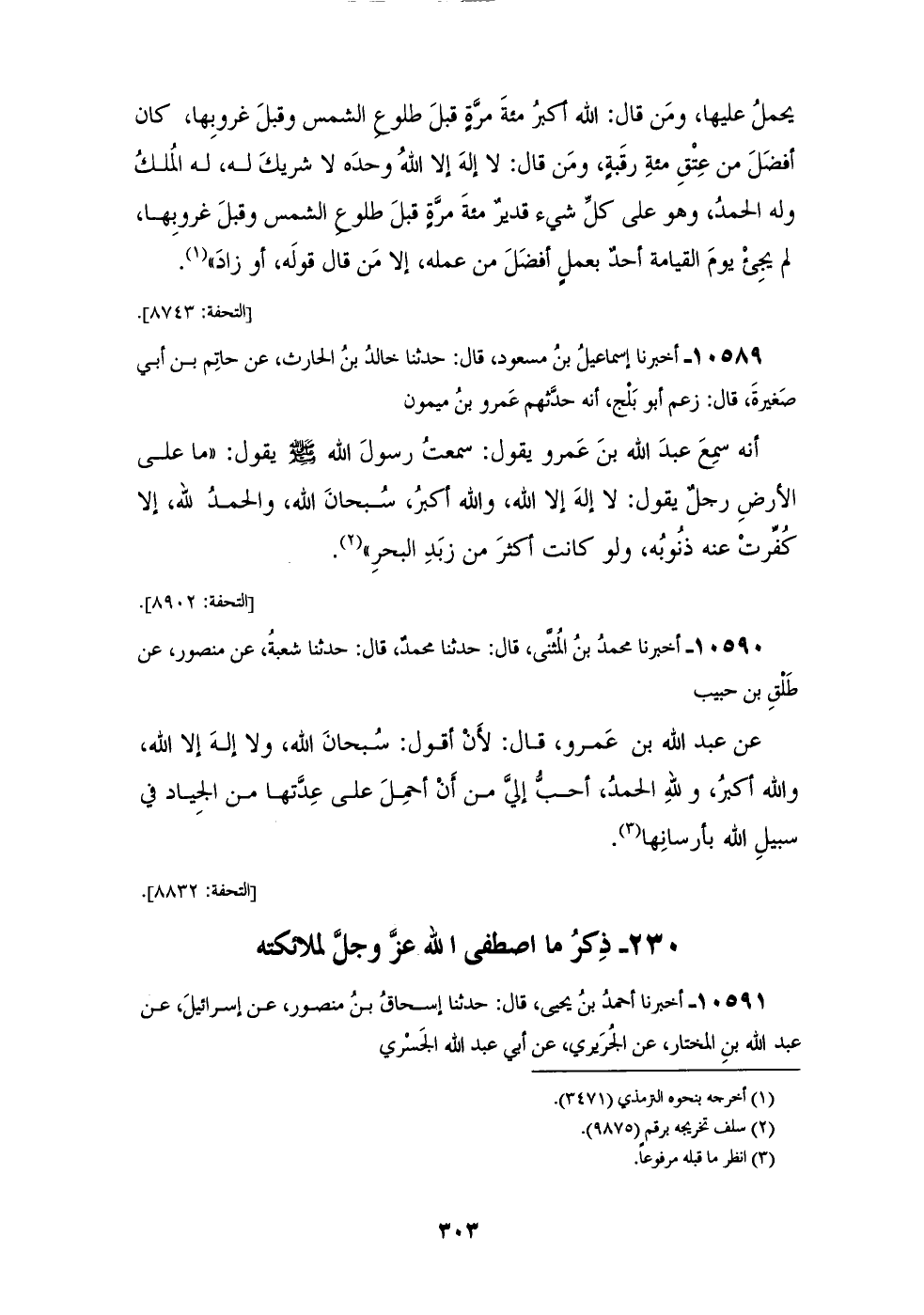 10589 - أَخْبَرَنَا إِسْمَاعِيلُ بْنُ مَسْعُودٍ، قَالَ: حَدَّثَنَا خَالِدُ بْنُ الْحَارِثِ، عَنْ حَاتِمِ بْنِ أَبِي صَغِيرَةَ، قَالَ: زَعَمَ أَبُو بَلْجٍ، أَنَّهُ حَدَّثَهُمْ عَمْرُو بْنُ مَيْمُونٍ، أَنَّهُ سَمِعَ عَبْدَ اللهِ بْنَ عَمْرٍو، يَقُولُ: سَمِعْتُ رَسُولَ اللهِ صَلَّى اللهُ عَلَيْهِ وَسَلَّمَ يَقُولُ: " §مَا عَلَى الْأَرْضِ رَجُلٌ يَقُولُ: لَا إِلَهَ إِلَّا اللهُ، وَاللهُ أَكْبَرُ، سُبْحَانَ اللهِ، وَالْحَمْدُ لِلَّهِ، إِلَّا كُفِّرَتْ عَنْهُ ذُنُوبُهُ وَلَوْ كَانَتْ أَكْثَرَ مِنْ زَبَدِ الْبَحْرِ "