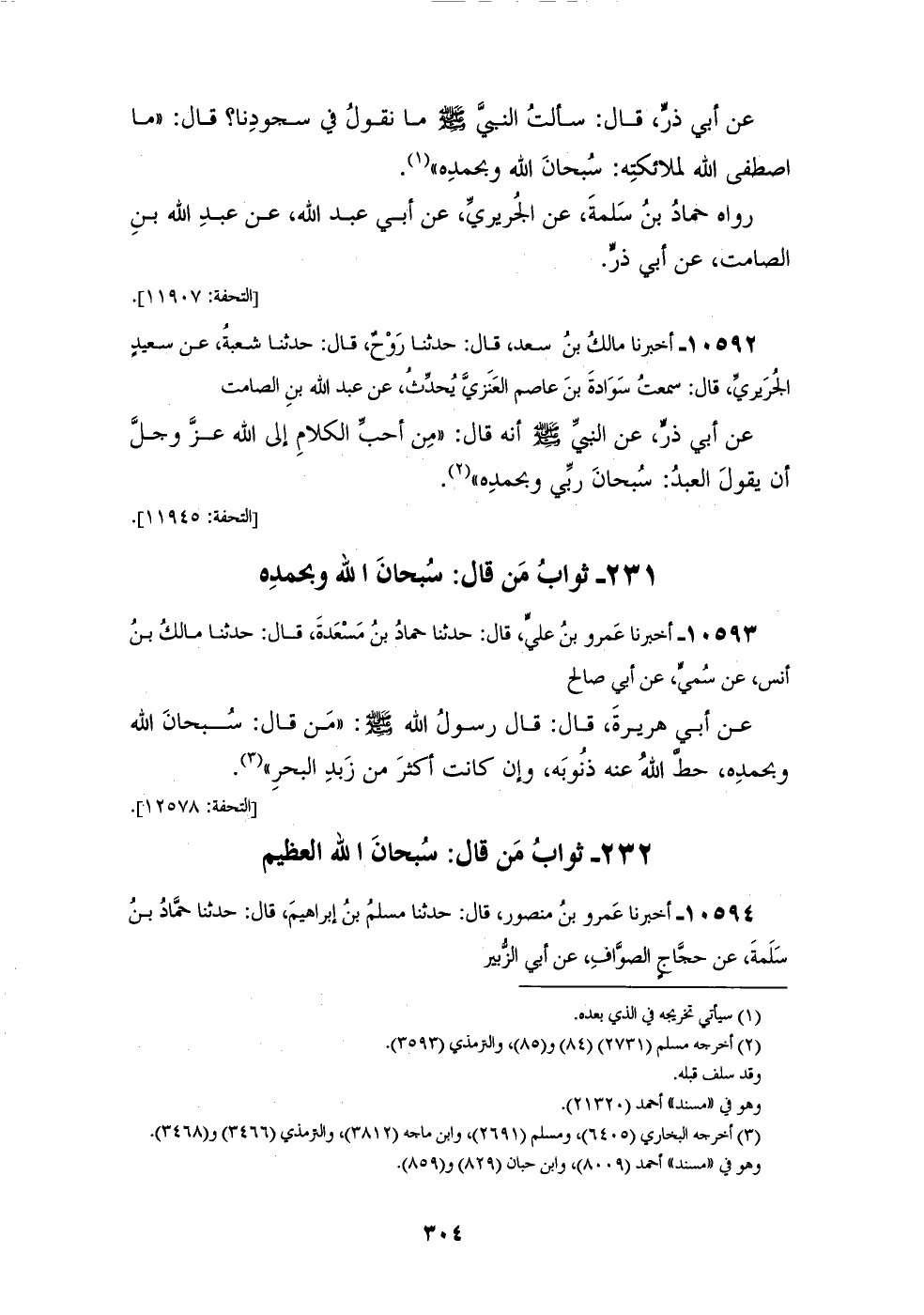 10592 - أَخْبَرَنَا مَالِكُ بْنُ سَعْدٍ، قَالَ: حَدَّثَنَا رَوْحٌ، قَالَ: حَدَّثَنَا شُعْبَةُ، عَنْ سَعِيدٍ الْجُرَيْرِيِّ، قَالَ: سَمِعْتُ سَوَادَةَ بْنَ عَاصِمٍ الْعَنَزِيَّ يُحَدِّثُ عَنْ عَبْدِ اللهِ بْنِ الصَّامِتِ، عَنْ أَبِي ذَرٍّ عَنِ النَّبِيِّ صَلَّى اللهُ عَلَيْهِ وَسَلَّمَ أَنَّهُ قَالَ: " §مَنْ أَحَبِّ الْكَلَامِ إِلَى اللهِ عَزَّ وَجَلَّ أَنْ يَقُولَ الْعَبْدُ: سُبْحَانَ رَبِّي وَبِحَمْدِهِ "