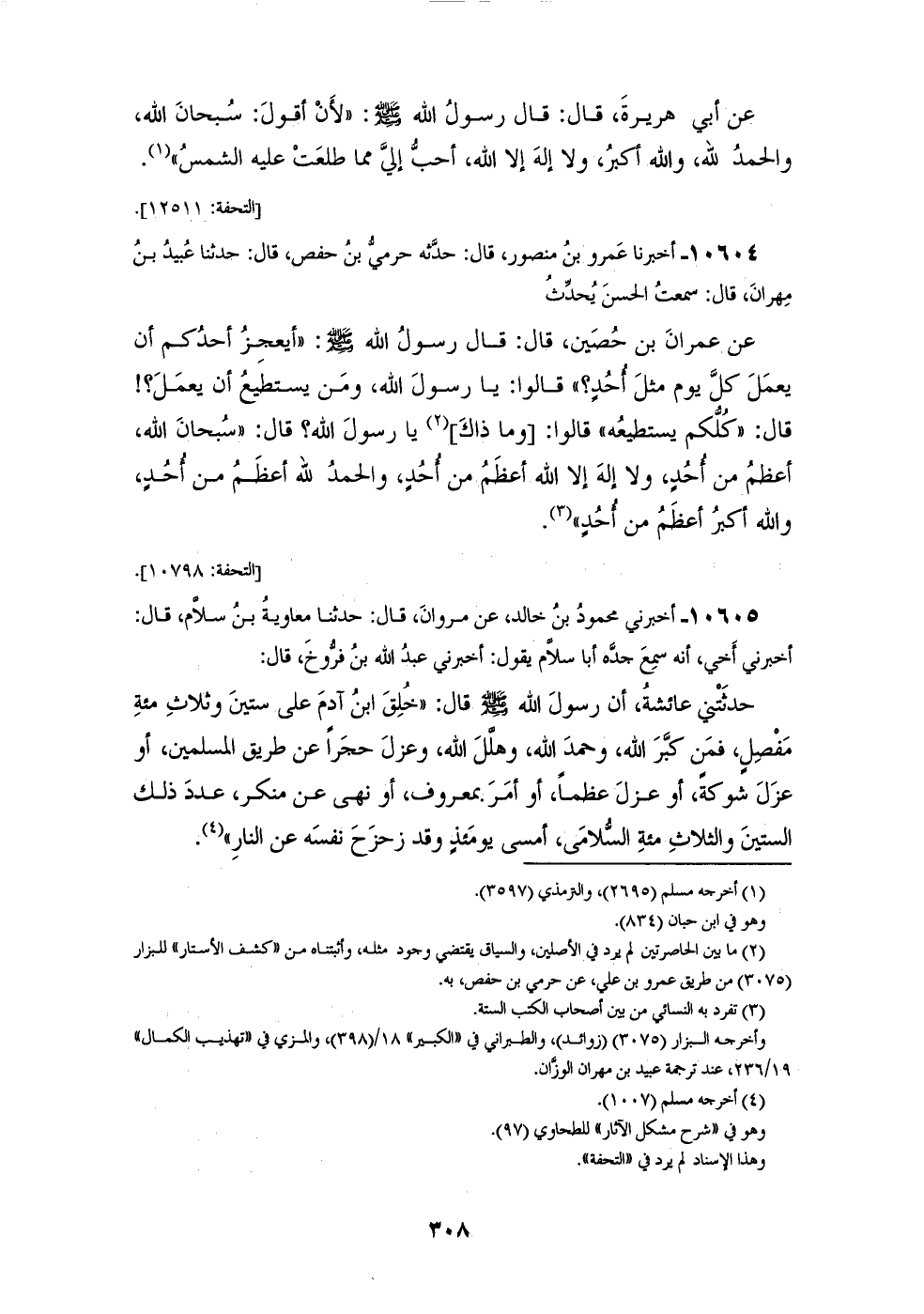 10604 - أَخْبَرَنَا عَمْرُو بْنُ مَنْصُورٍ، قَالَ: حَدَّثَهُ حَرَمِيُّ بْنُ حَفْصٍ، قَالَ: حَدَّثَنَا عُبَيْدُ بْنُ مِهْرَانَ، قَالَ: سَمِعْتُ الْحَسَنَ، يُحَدِّثُ، عَنْ عِمْرَانَ بْنِ حُصَيْنٍ، قَالَ: قَالَ رَسُولُ اللهِ صَلَّى اللهُ عَلَيْهِ وَسَلَّمَ: «§أَيَعْجِزُ أَحَدُكُمْ أَنْ يَعْمَلَ كُلَّ يَوْمٍ مِثْلَ أُحُدٍ؟» قَالُوا: يَا رَسُولَ اللهِ، وَمَنْ يَسْتَطِيعُ أَنْ يَعْمَلَ؟ قَالَ: «كُلُّكُمْ يَسْتَطِيعُهُ» قَالُوا: وَمَا ذَاكَ يَا رَسُولَ اللهِ؟ قَالَ: «سُبْحَانَ اللهِ أَعْظَمُ مِنْ أُحُدٍ، وَلَا إِلَهَ إِلَّا اللهُ أَعْظَمُ مِنْ أُحُدٍ، وَالْحَمْدُ لِلَّهِ أَعْظَمُ مِنْ أُحُدٍ، وَاللهُ أَكْبَرُ أَعْظَمُ مِنْ أُحُدٍ»