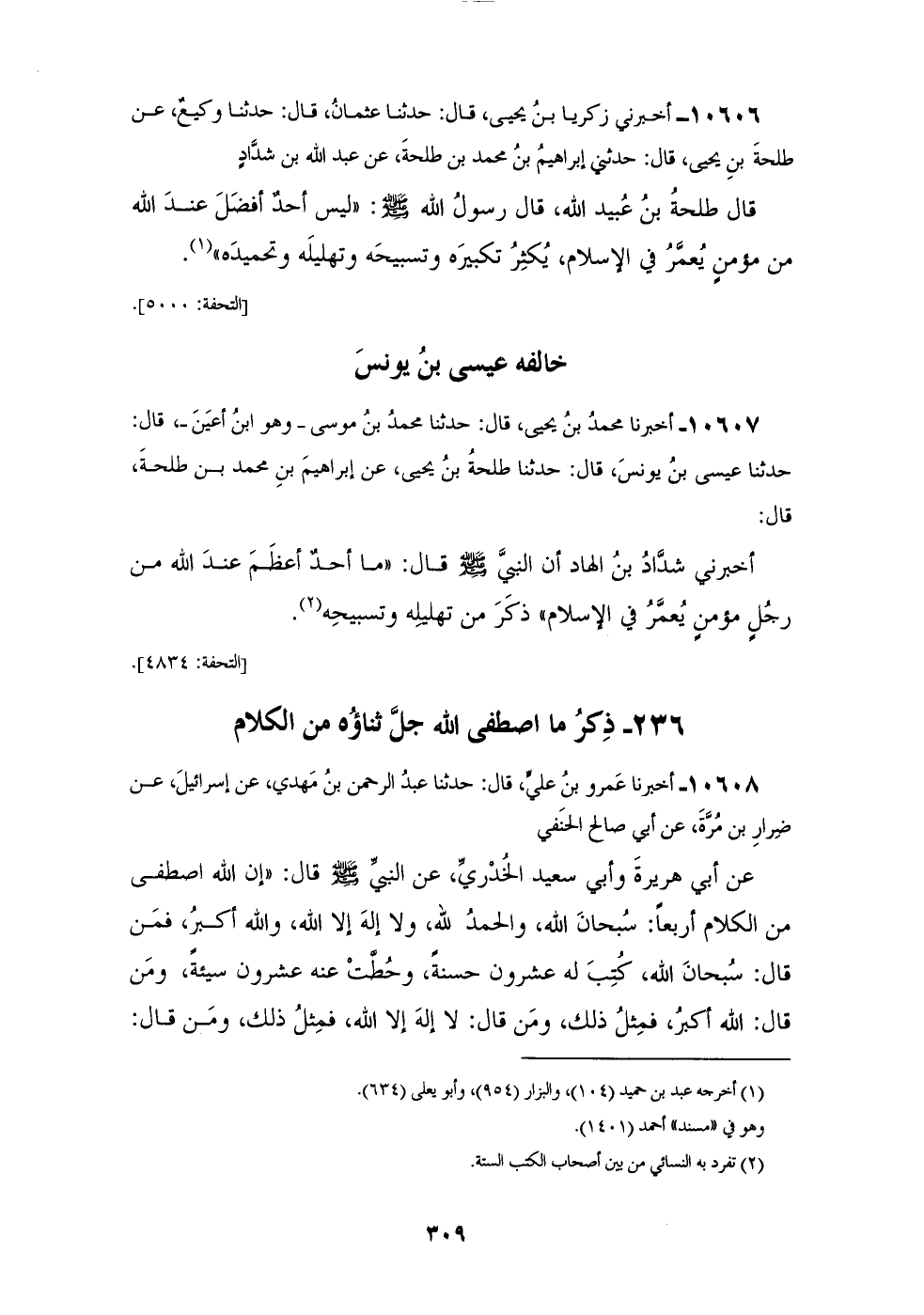 10606 - أَخْبَرَنِي زَكَرِيَّا بْنُ يَحْيَى، قَالَ: حَدَّثَنَا عُثْمَانُ، قَالَ: حَدَّثَنَا وَكِيعٌ، عَنْ طَلْحَةَ بْنِ يَحْيَى، قَالَ: حَدَّثَنِي إِبْرَاهِيمُ بْنُ مُحَمَّدِ بْنِ طَلْحَةَ، عَنْ عَبْدِ اللهِ بْنِ شَدَّادٍ، قَالَ طَلْحَةُ بْنُ عُبَيْدِ اللهِ: قَالَ رَسُولُ اللهِ صَلَّى اللهُ عَلَيْهِ وَسَلَّمَ: «§لَيْسَ أَحَدٌ أَفْضَلَ عِنْدَ اللهِ مِنْ مُؤْمِنٍ يُعَمَّرُ فِي الْإِسْلَامِ، يُكْثِرُ تَكْبِيرَهُ، وَتَسْبِيحَهُ، وَتَهْلِيلَهُ، وَتَحْمِيدَهُ» خَالَفَهُ عِيسَى بْنُ يُونُسَ