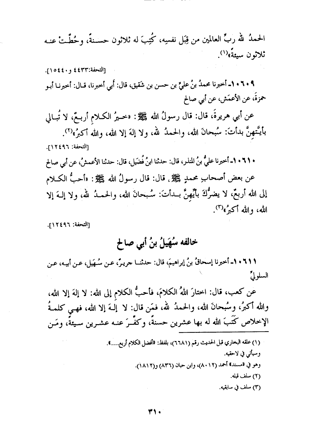 10610 - أَخْبَرَنَا عَلِيُّ بْنُ الْمُنْذِرِ، قَالَ: حَدَّثَنَا ابْنُ فُضَيْلٍ، قَالَ: حَدَّثَنَا الْأَعْمَشُ، عَنْ أَبِي صَالِحٍ، عَنْ بَعْضِ أَصْحَابِ مُحَمَّدٍ صَلَّى اللهُ عَلَيْهِ وَسَلَّمَ، قَالَ: قَالَ رَسُولُ اللهِ صَلَّى اللهُ عَلَيْهِ وَسَلَّمَ: " §أَحَبُّ الْكَلَامِ إِلَى اللهِ أَرْبَعٌ، لَا يَضُرُّكَ بِأَيِّهِنَّ بَدَأْتَ: سُبْحَانَ اللهِ، وَالْحَمْدُ لِلَّهِ، وَلَا إِلَهَ إِلَّا اللهُ، وَاللهُ أَكْبَرُ " خَالَفَهُ سُهَيْلُ بْنُ أَبِي صَالِحٍ
