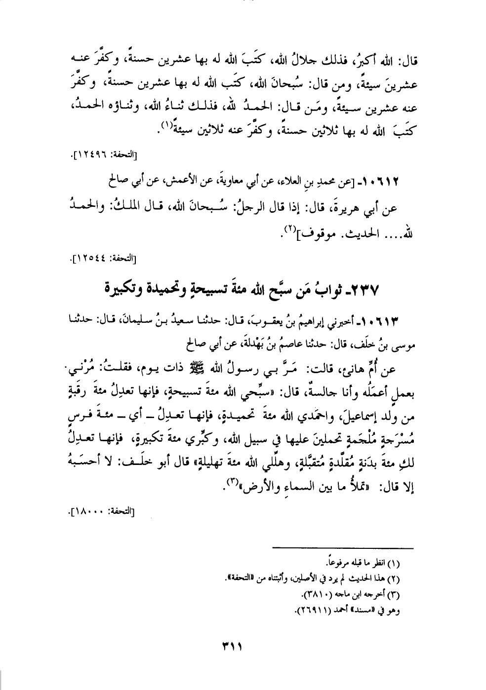 §ثَوَابُ مَنْ سَبَّحَ اللهَ مِائَةَ تَسْبِيحَةٍ وَتَحْمِيدَةٍ وَتَكْبِيرَةٍ