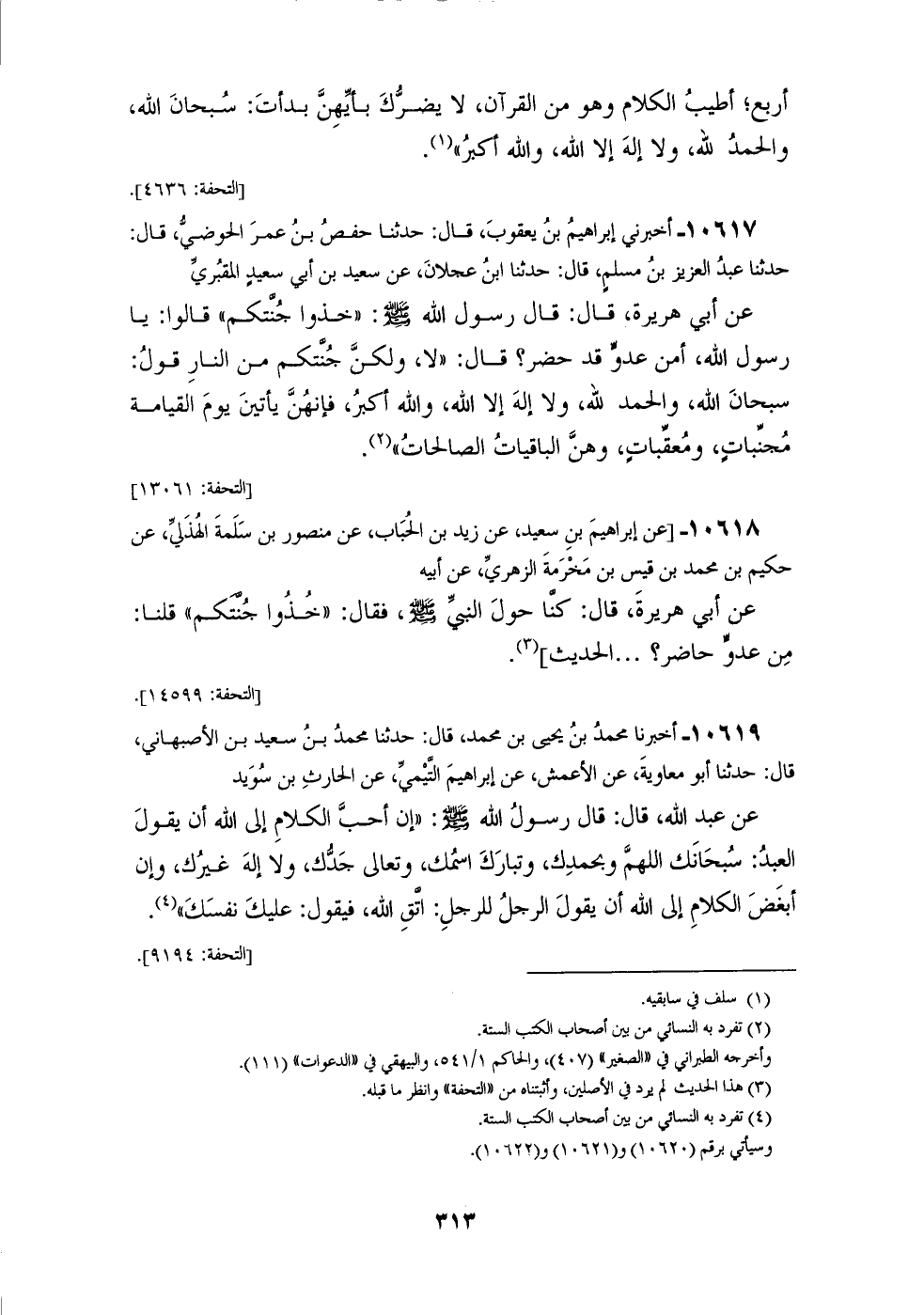 10617 - أَخْبَرَنِي إِبْرَاهِيمُ بْنُ يَعْقُوبَ، قَالَ: حَدَّثَنَا حَفْصُ بْنُ عُمَرَ الْحَوْضِيُّ، قَالَ: حَدَّثَنَا عَبْدُ الْعَزِيزِ بْنُ مُسْلِمٍ، قَالَ: حَدَّثَنَا ابْنُ عَجْلَانَ، عَنْ سَعِيدِ بْنِ أَبِي سَعِيدٍ الْمَقْبُرِيِّ، عَنْ أَبِي هُرَيْرَةَ، قَالَ: قَالَ رَسُولُ اللهِ صَلَّى اللهُ عَلَيْهِ وَسَلَّمَ: «§خُذُوا جُنَّتَكُمْ» قَالُوا: يَا رَسُولَ اللهِ، أَمِنْ عَدُوٍّ قَدْ حَضَرَ؟ قَالَ: " لَا، وَلَكِنْ جُنَّتُكُمْ مِنَ النَّارِ قَوْلُ: سُبْحَانَ اللهِ، وَالْحَمْدُ لِلَّهِ، وَلَا إِلَهَ إِلَّا اللهُ، وَاللهُ أَكْبَرُ، فَإِنَّهُنَّ يَأْتِينَ يَوْمَ الْقِيَامَةِ مُجَنِّبَاتٍ وَمُعَقِّبَاتٍ، وَهُنَّ الْبَاقِيَاتُ الصَّالِحَاتُ "