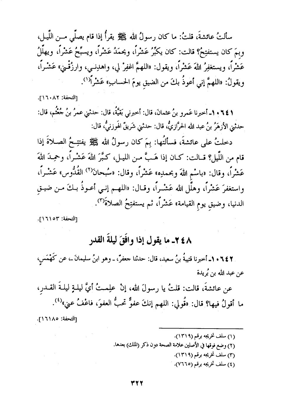 10642 - أَخْبَرَنَا قُتَيْبَةُ بْنُ سَعِيدٍ، قَالَ: حَدَّثَنَا جَعْفَرٌ وَهُوَ ابْنُ سُلَيْمَانَ، عَنْ كَهْمَسٍ، عَنْ عَبْدِ اللهِ بْنِ بُرَيْدَةَ، عَنْ عَائِشَةَ، قَالَتْ: قُلْتُ: يَا رَسُولَ اللهِ، إِنَّ عَلِمْتُ أَيُّ لَيْلَةٍ لَيْلَةُ الْقَدْرِ، مَا أَقُولُ فِيهَا؟ قَالَ قَوْلِي: «§اللهُمَّ إِنَّكَ عَفُوٌّ تُحِبُّ الْعَفْوَ فَاعْفُ عَنِّي»