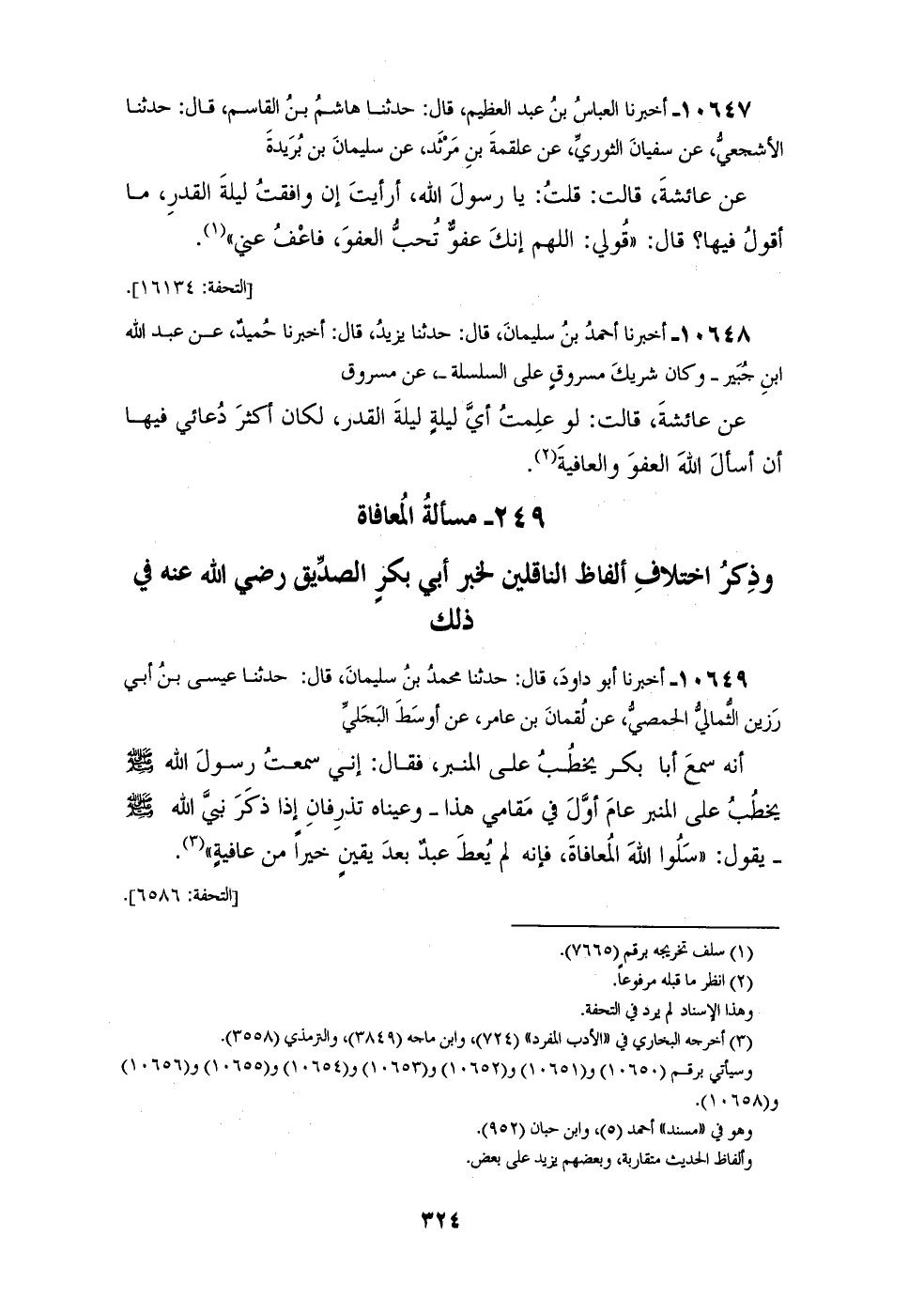 10648 - أَخْبَرَنَا أَحْمَدُ بْنُ سُلَيْمَانَ، قَالَ: حَدَّثَنَا يَزِيدُ، قَالَ: أَخْبَرَنَا حُمَيْدٌ، عَنْ عَبْدِ اللهِ بْنِ جُبَيْرٍ وَكَانَ شَرِيكَ مَسْرُوقٍ عَلَى السِّلْسِلَةِ، عَنْ مَسْرُوقٍ، عَنْ عَائِشَةَ قَالَتْ: «§لَوْ عَلِمْتُ أَيُّ لَيْلَةٍ لَيْلَةُ الْقَدْرِ لَكَانَ أَكْثَرَ دُعَائِي فِيهَا أَنْ أَسْأَلَ اللهَ الْعَفْوَ وَالْعَافِيَةَ»