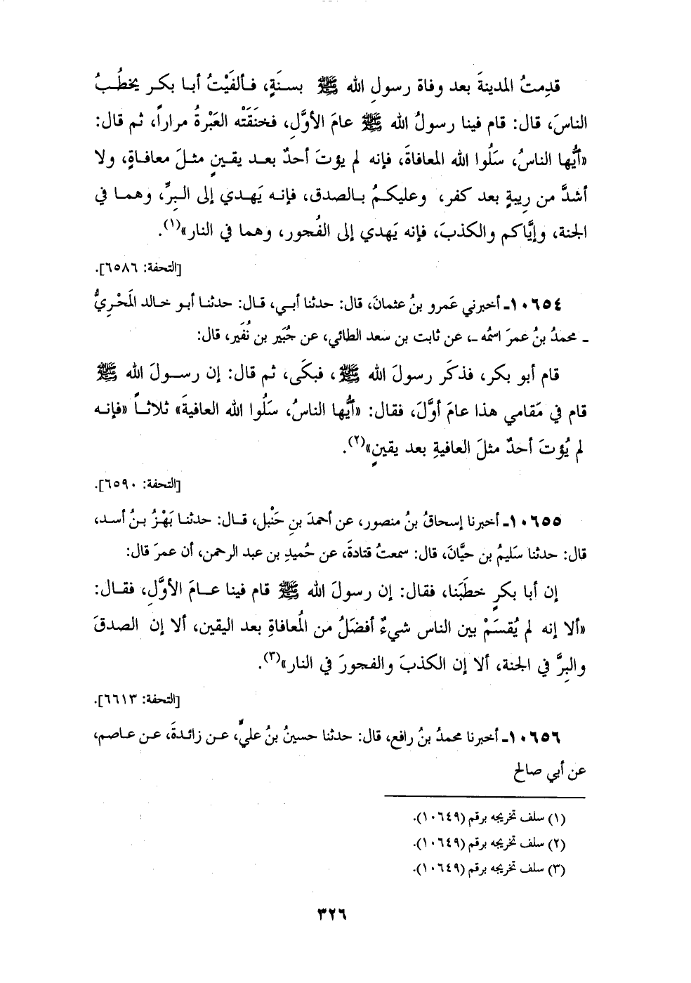 10654 - أَخْبَرَنِي عَمْرُو بْنُ عُثْمَانَ، قَالَ: حَدَّثَنَا أَبِي قَالَ: حَدَّثَنَا أَبُو خَالِدٍ الْمَحْرِيُّ مُحَمَّدُ بْنُ عُمَرَ اسْمُهُ، عَنْ ثَابِتِ بْنِ سَعْدٍ الطَّائِيِّ، عَنْ جُبَيْرِ بْنِ نُفَيْرٍ، قَالَ: قَامَ أَبُو بَكْرٍ فَذَكَرَ رَسُولَ اللهِ صَلَّى اللهُ عَلَيْهِ وَسَلَّمَ فَبَكَى، ثُمَّ قَالَ: إِنَّ رَسُولَ اللهِ صَلَّى اللهُ عَلَيْهِ وَسَلَّمَ قَامَ فِي مَقَامِي هَذَا عَامَ أَوَّلَ فَقَالَ: «أَيُّهَا النَّاسُ §سَلُوا اللهَ الْعَافِيَةَ - ثَلَاثًا - فَإِنَّهُ لَمْ يُؤْتَ أَحَدٌ مِثْلَ الْعَافِيَةَ بَعْدَ يَقِينٍ»