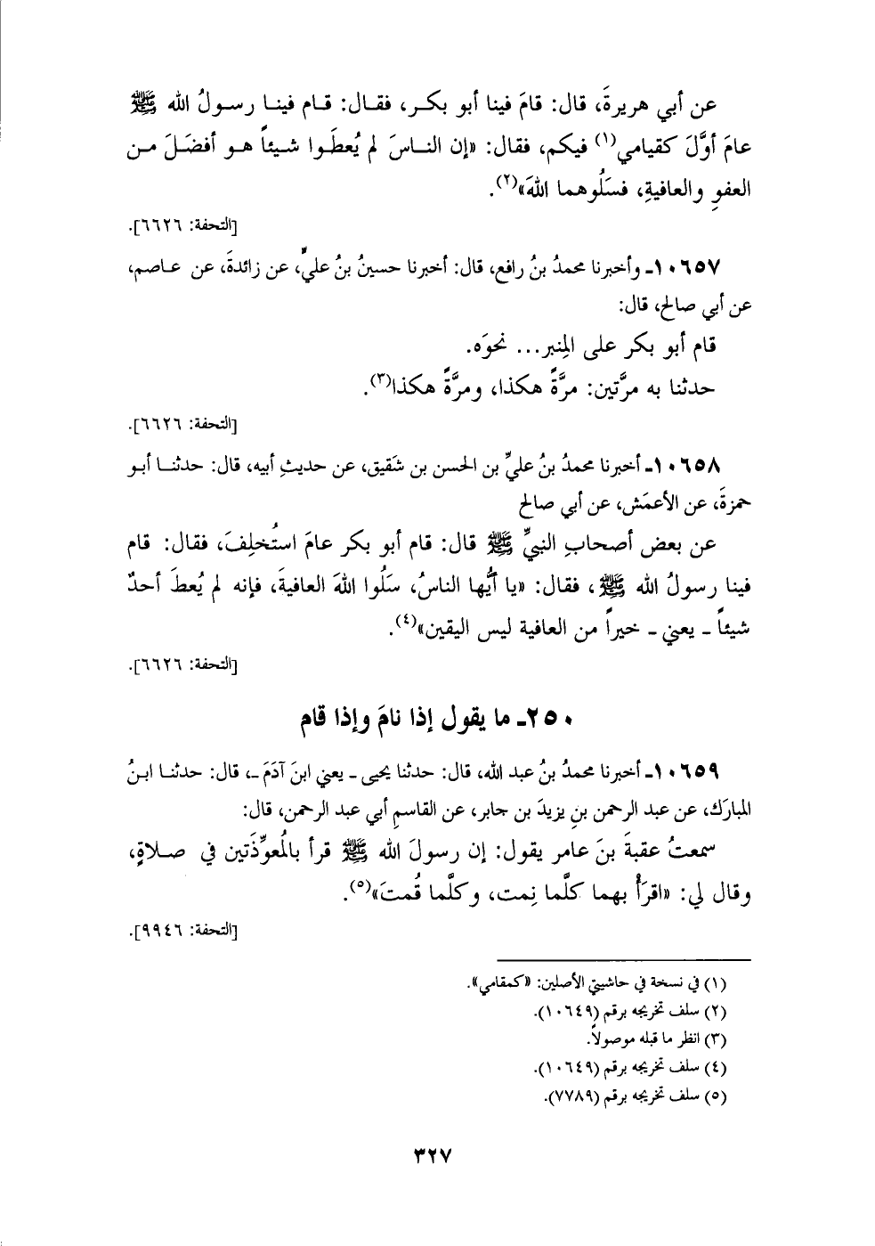 10658 - أَخْبَرَنَا مُحَمَّدُ بْنُ عَلِيِّ بْنِ الْحَسَنِ بْنِ شَقِيقٍ، عَنْ حَدِيثِ أَبِيهِ، قَالَ: حَدَّثَنَا أَبُو حَمْزَةَ، عَنِ الْأَعْمَشِ، عَنْ أَبِي صَالِحٍ، عَنْ بَعْضِ، أَصْحَابِ النَّبِيِّ صَلَّى اللهُ عَلَيْهِ وَسَلَّمَ قَالَ: قَامَ أَبُو بَكْرٍ عَامَ اسْتُخْلِفَ فَقَالَ: قَامَ فِينَا رَسُولُ اللهِ صَلَّى اللهُ عَلَيْهِ وَسَلَّمَ فَقَالَ: «يَا أَيُّهَا النَّاسُ §سَلُوا اللهَ الْعَافِيَةَ، فَإِنَّهُ لَمْ يُعْطَ أَحَدٌ شَيْئًا، يَعْنِي خَيْرًا مِنَ الْعَافِيَةِ لَيْسَ الْيَقِينَ»