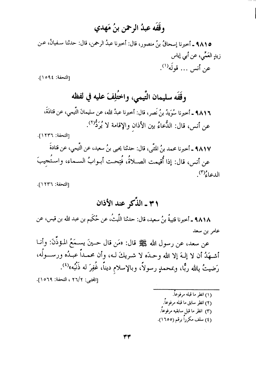 9816 - أَخْبَرَنَا سُوَيْدُ بْنُ نَصْرٍ قَالَ: أَخْبَرَنَا عَبْدُ اللهِ، عَنْ سُلَيْمَانَ التَّيْمِيِّ، عَنْ قَتَادَةَ، عَنْ أَنَسٍ قَالَ: «§الدُّعَاءُ بَيْنَ الْأَذَانِ وَالْإِقَامَةِ لَا يُرَدُّ»