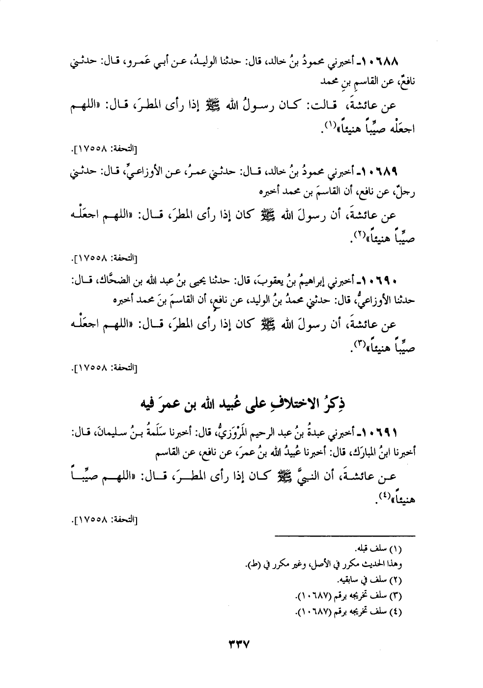 10691 - أَخْبَرَنِي عَبْدَةُ بْنُ عَبْدِ الرَّحِيمِ الْمَرْوَزِيُّ، قَالَ: أَخْبَرَنَا سَلَمَةُ بْنُ سُلَيْمَانَ، قَالَ: أَخْبَرَنَا ابْنُ الْمُبَارَكِ، قَالَ: أَخْبَرَنَا عُبَيْدُ اللهِ بْنُ عُمَرَ، عَنْ نَافِعٍ، عَنِ الْقَاسِمِ، عَنْ عَائِشَةَ، أَنَّ النَّبِيَّ صَلَّى اللهُ عَلَيْهِ وَسَلَّمَ كَانَ إِذَا رَأَى الْمَطَرَ قَالَ: «§اللهُمَّ صَيِّبًا هَنِيئًا»